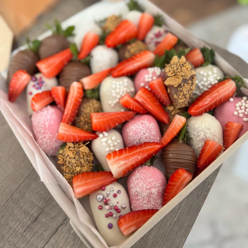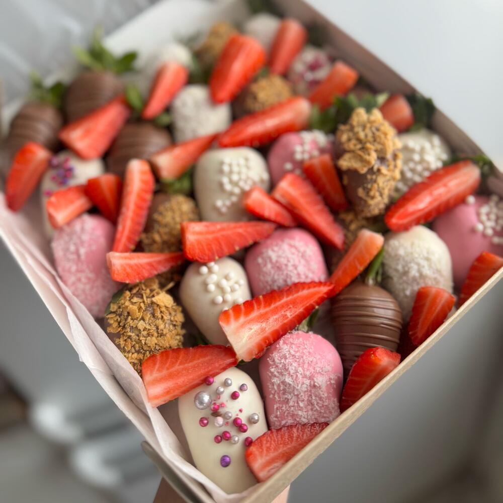 свежая клубника в бельгийском белом и молочном шоколаде - 25 шт Состав шоколада: какао-масло, тертое какао, сухое цельное молоко, сахар, натуральные лецитин и ваниль