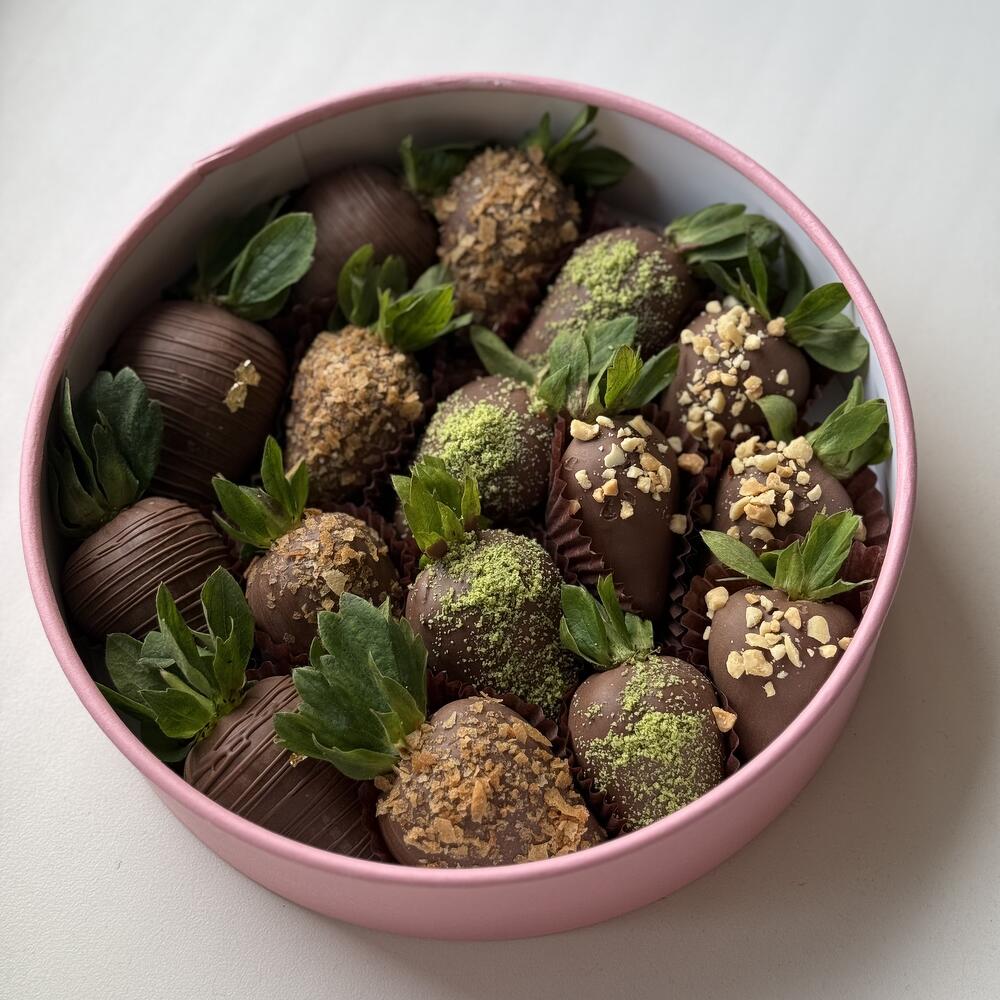 Strawberries 16 pieces, milk chocolate Callebaut 100 g, topping peanut, pistachio, waffle 20 g