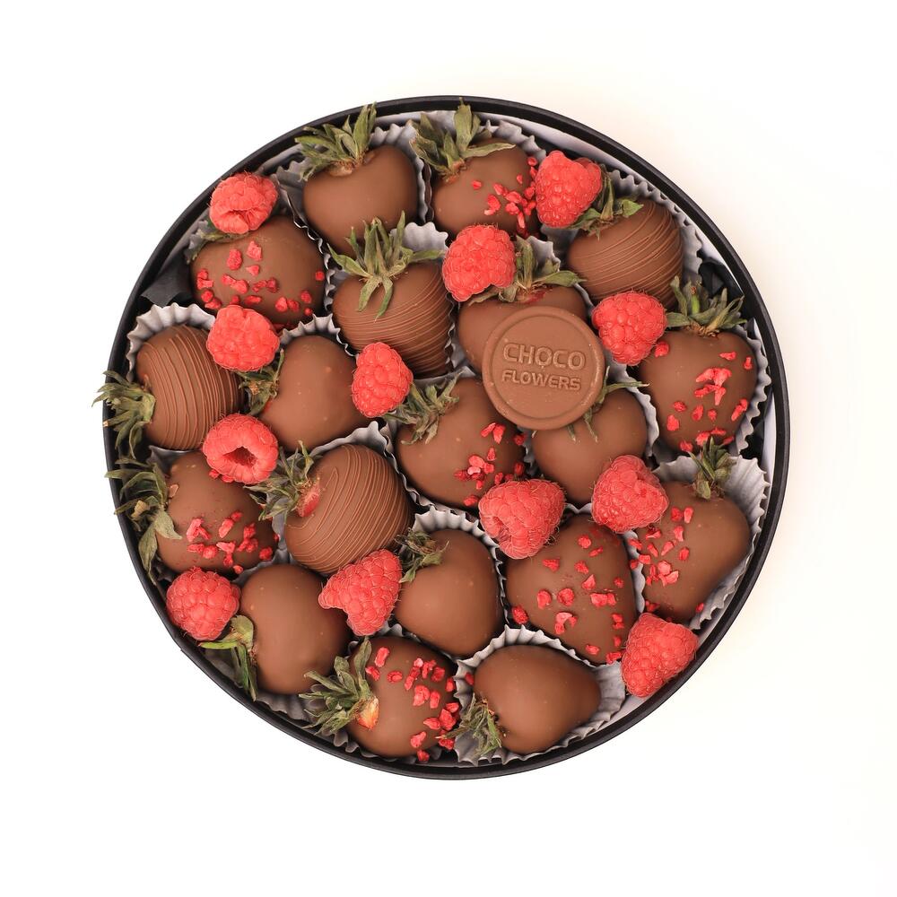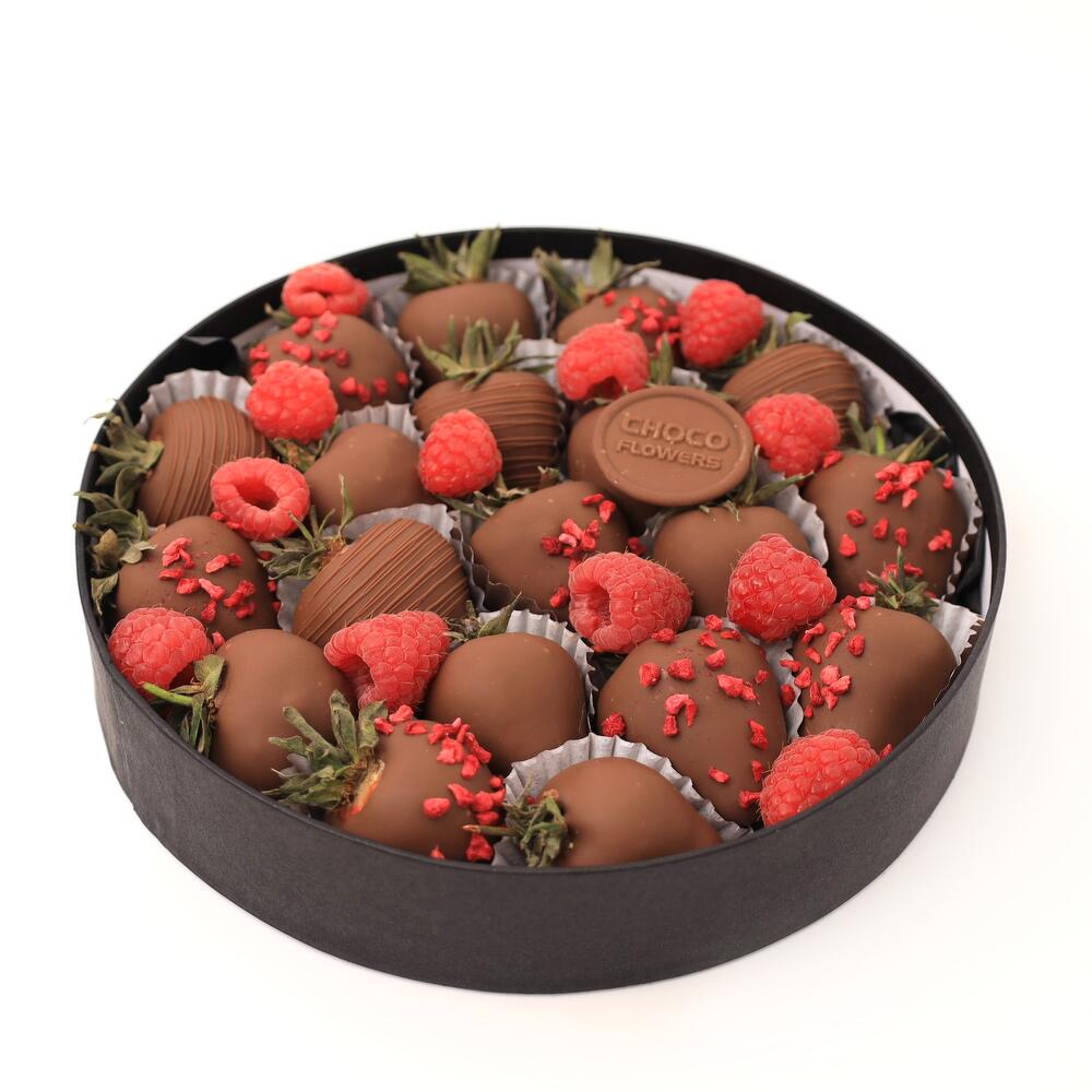 Клубника в молочном шоколаде: 13-15 шт (по наполнению) Свежая малина: 40-45 гр