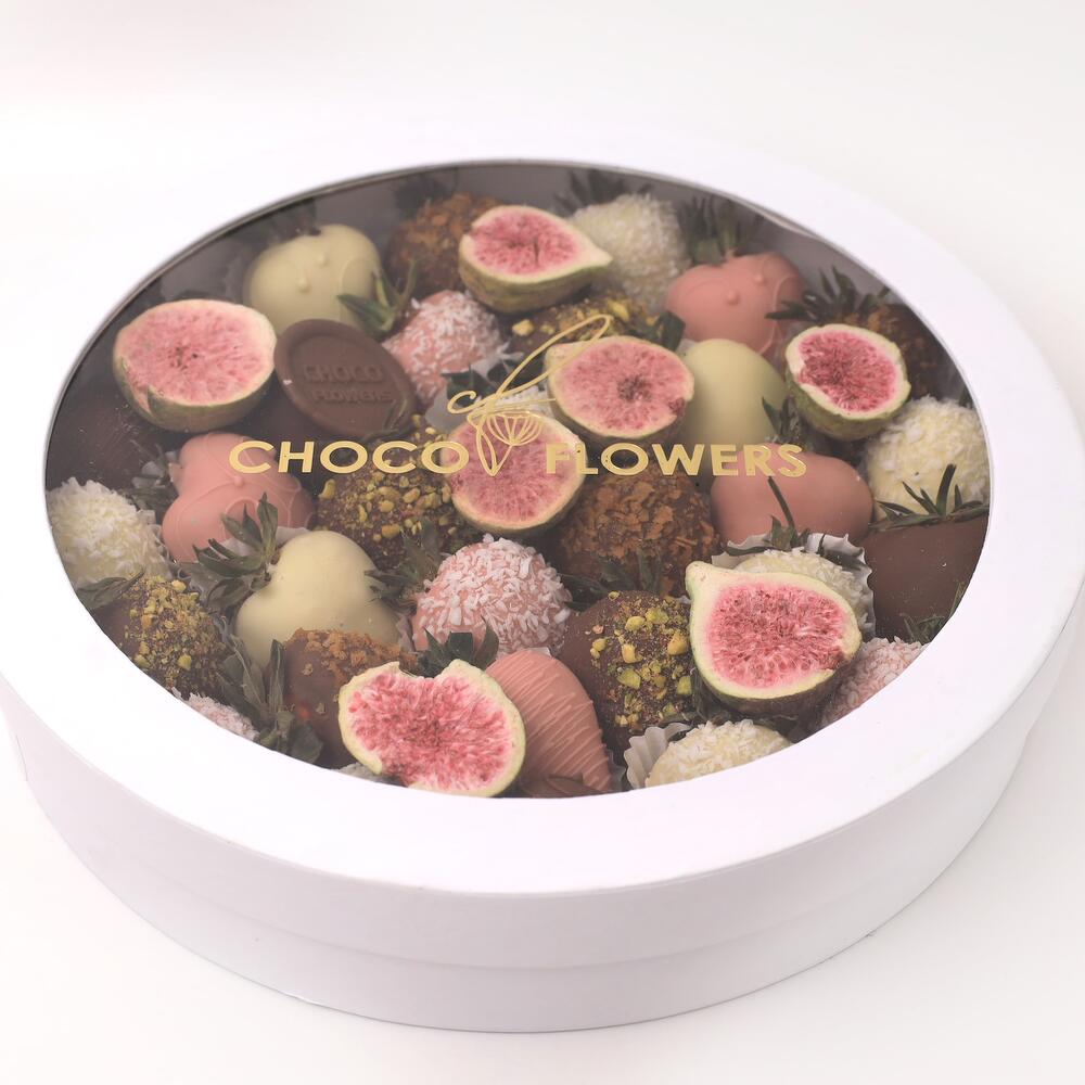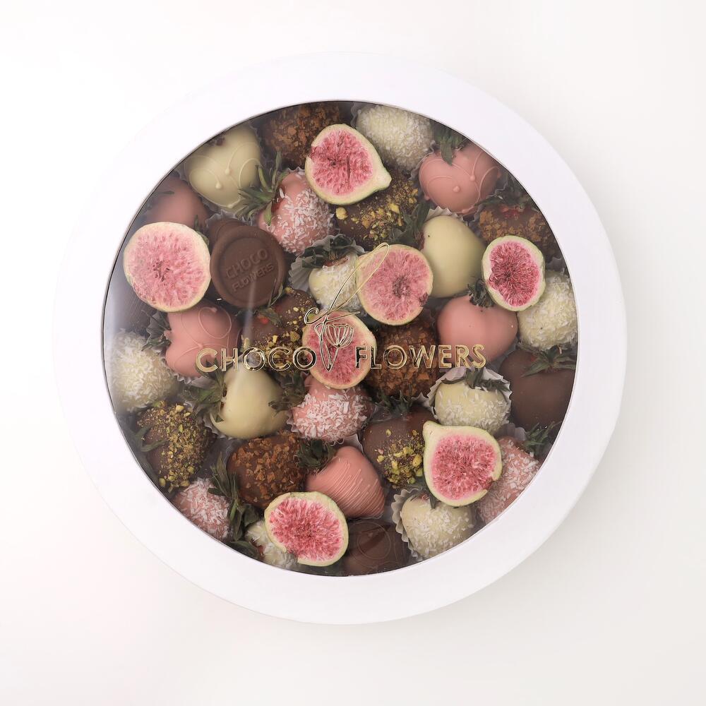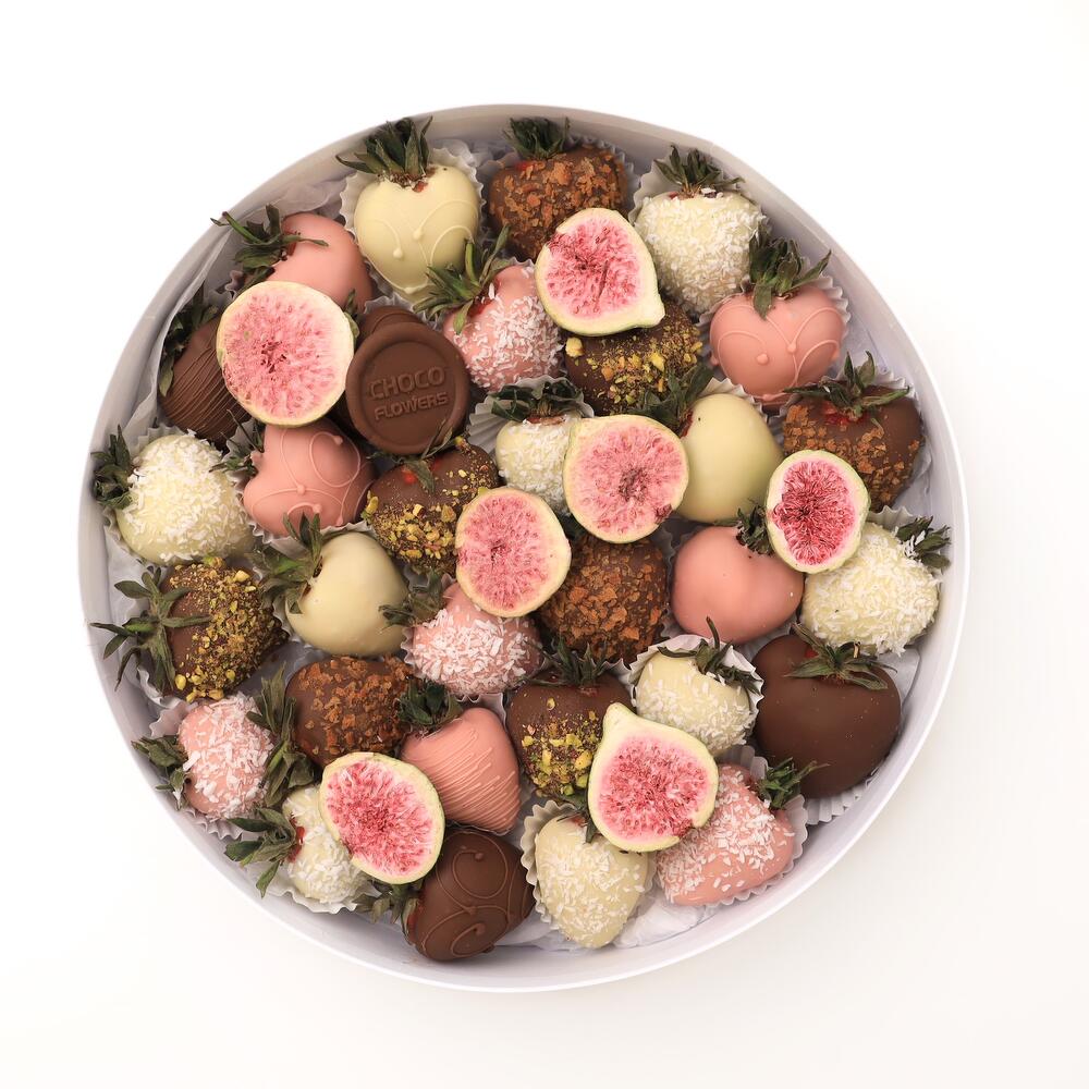 Клубника в молочном/розовом/белом шоколаде : 27-30 шт С инжиром, кокосом, вафлей