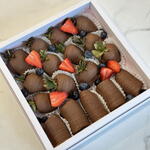 Свежая клубника, молочный шоколад Callebaut (сахар, какао-масло, цельное молоко в порошке, какао-масса, эмульгатор — соевый лецитин, натуральный ароматизатор ванили)