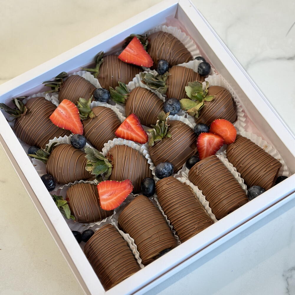 Свежая клубника, молочный шоколад Callebaut (сахар, какао-масло, цельное молоко в порошке, какао-масса, эмульгатор — соевый лецитин, натуральный ароматизатор ванили)