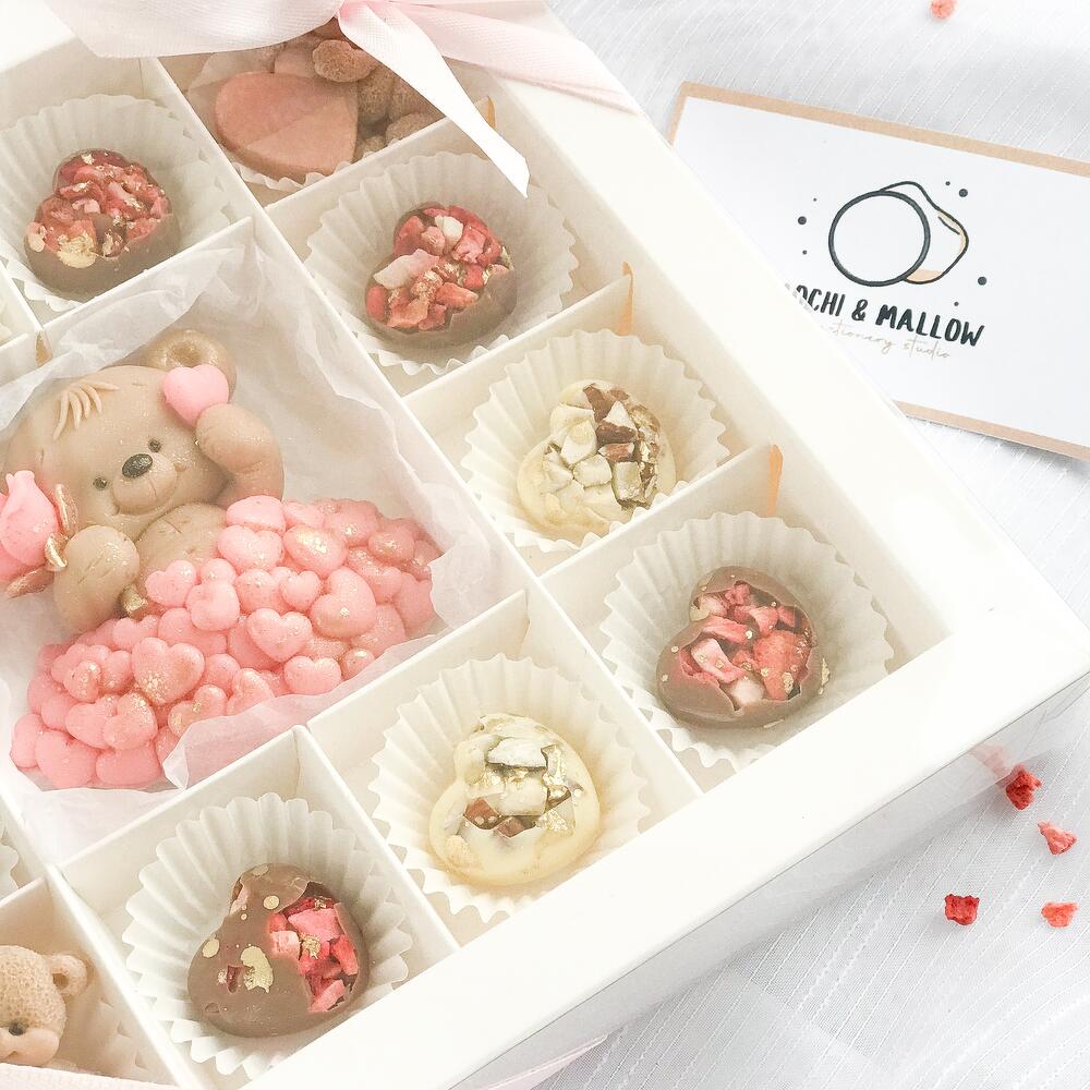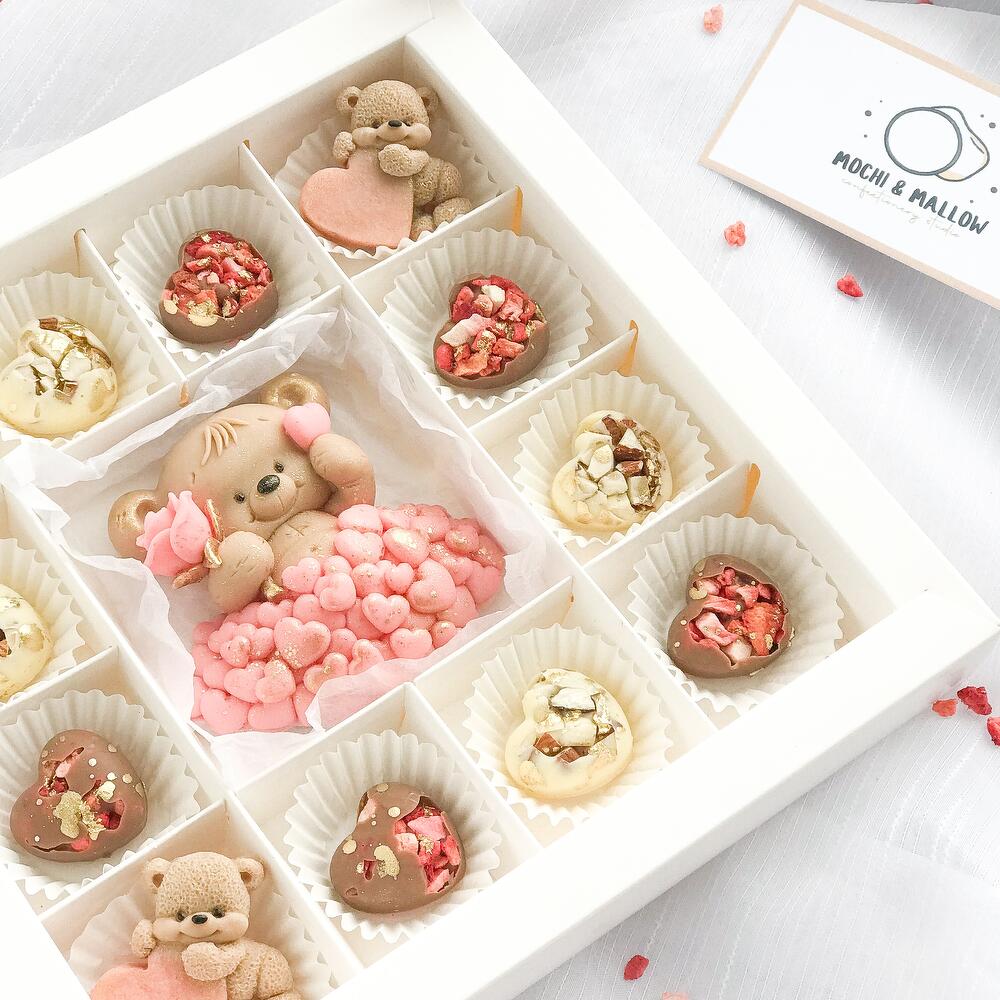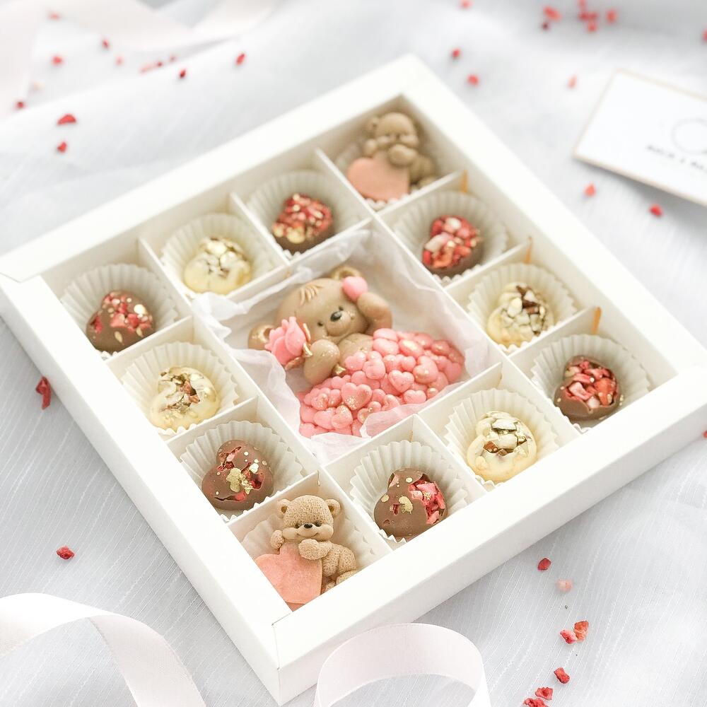 A set of chocolates is the perfect sweet surprise for your loved ones or at any romantic moment! 🐻❤️ This charming set includes: - 2 cute teddy bears with hearts made of delicate white and milky Italian chocolate. These sweet figurines symbolize love and care, perfect for expressing feelings. - 10 pieces of chocolates in the form of hearts: 4 of white chocolate with pieces of crunchy almonds and 6 of milk chocolate with freeze-dried strawberries. Each bite will give you a harmony of sweetness and textural contrast! - A chocolate figurine with a teddy bear surrounded by cute hearts, which will become a bright accent of your gift. This figurine will not only please the eye, but also surprise with its taste and originality. , Set Features: - Perfect for romantic moments: Please your soulmate with the personification of love and warmth. - Juicy flavor combination: Delicate white chocolate, rich milk chocolate with strawberry notes and crunchy almonds – this is a real feast for gourmets! -💝 Presentable packaging: Each candy is neatly placed in a stylish package, ready to become a gorgeous gift. Give your loved ones a piece of happiness with our set! 🍫💖 *Each figurine is made individually, so the pink color may vary slightly.