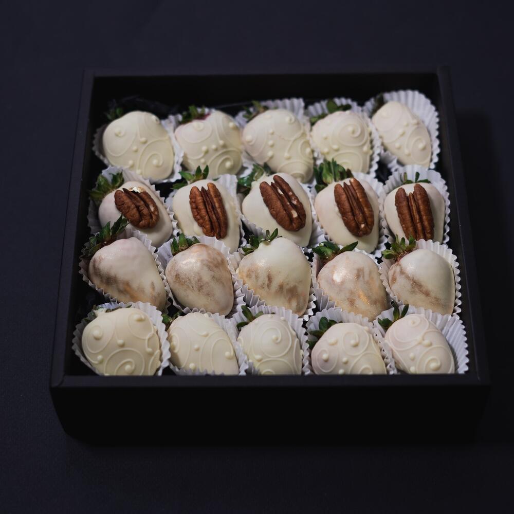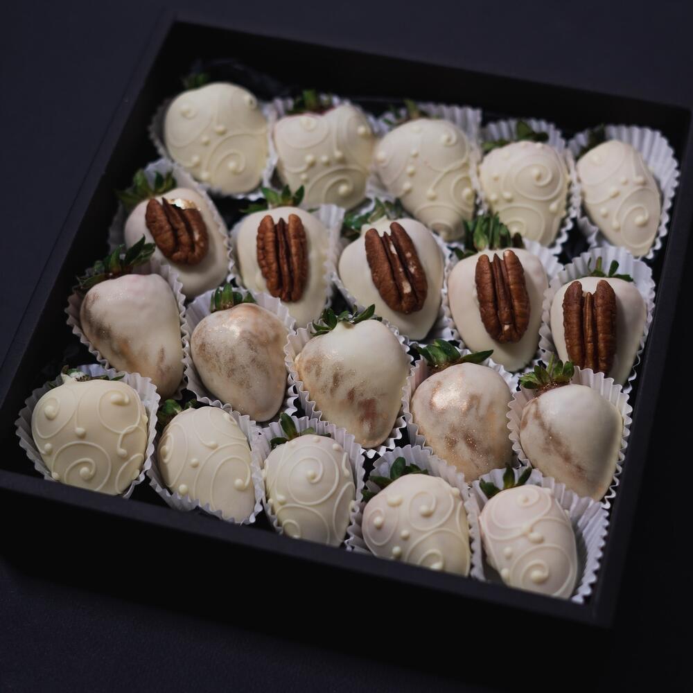 Набор из 20 крупных клубник, в белом бельгийском шоколаде украшенный орехами пекан