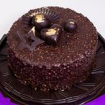 Насыщенный шоколадный бисквит с кремом и хрустящей глазурью, украшен фигурным декором и трюфелями с золотым акцентом.