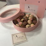 1. Fresh strawberries 2. Chocolate: – White chocolate: Sugar, whole milk powder, cocoa butter, emulsifier (lecithin), natural vanillin. • Milk chocolate: Sugar, cocoa butter, cocoa mass, milk powder, whey powder, emulsifier (lecithin), vanillin. • Dark chocolate: Cocoa mass, sugar, cocoa butter, emulsifier (lecithin), vanillin. 3. Sprinkles: – Sugar pearls – Decorative sugar beads – White chocolate flowers