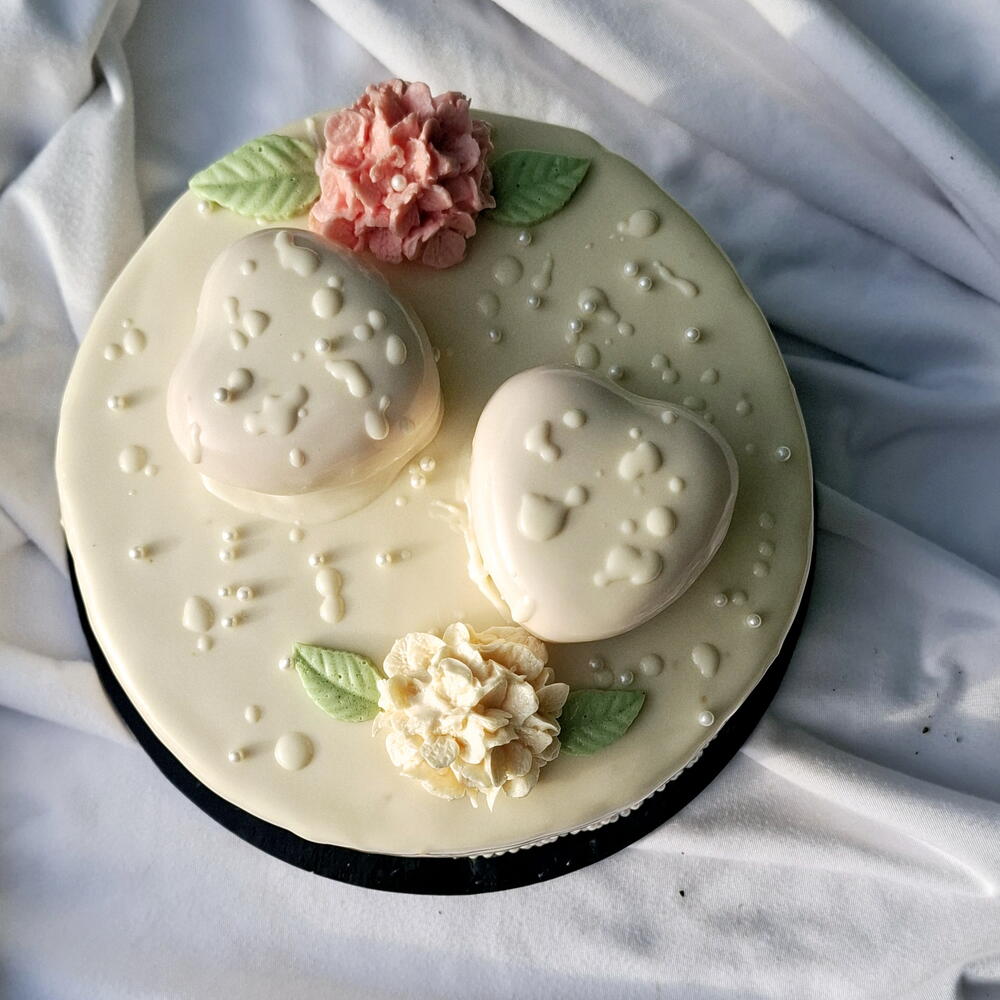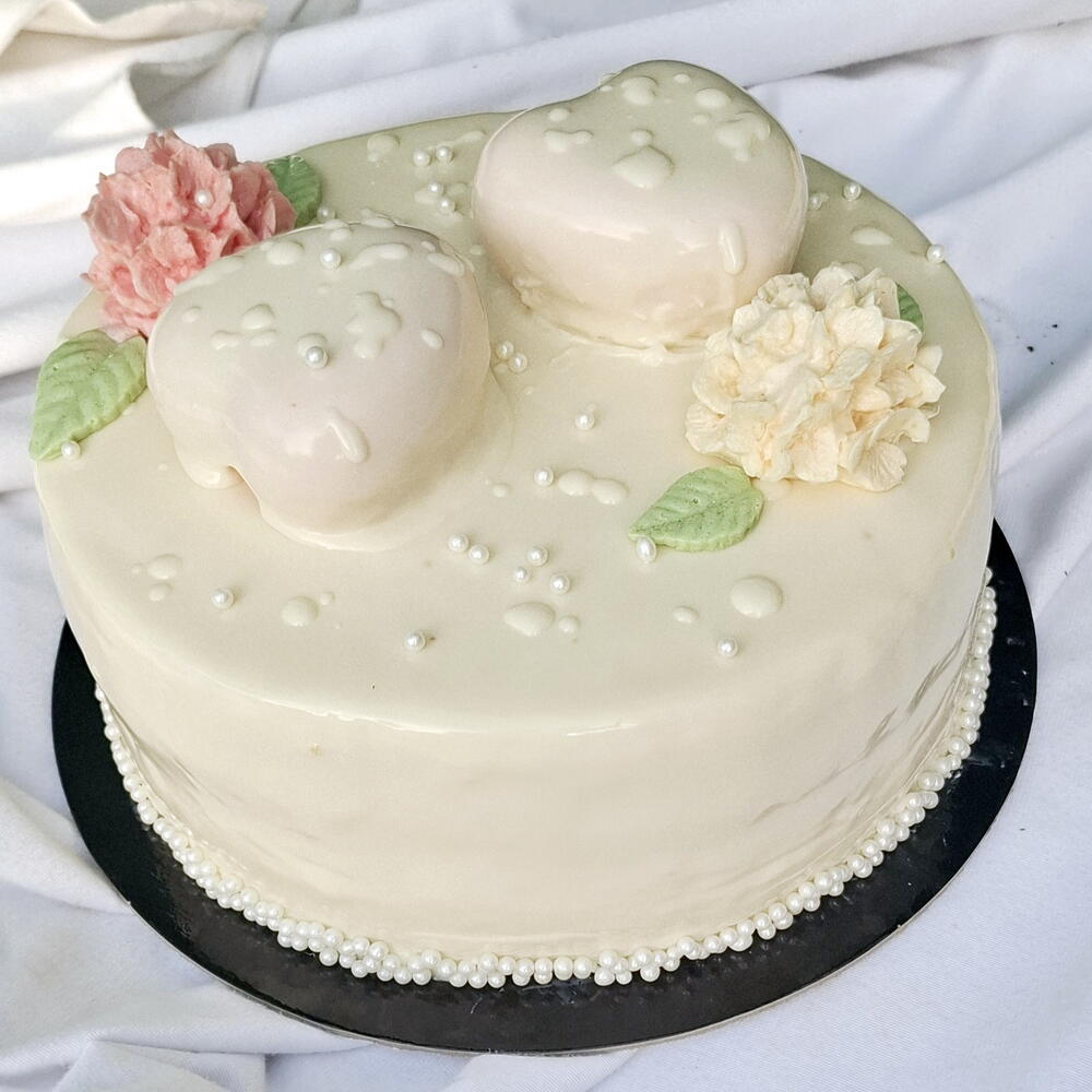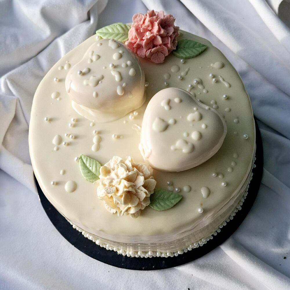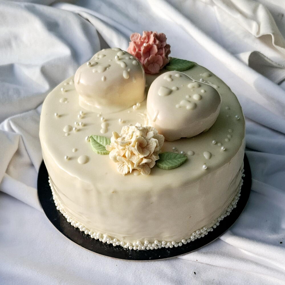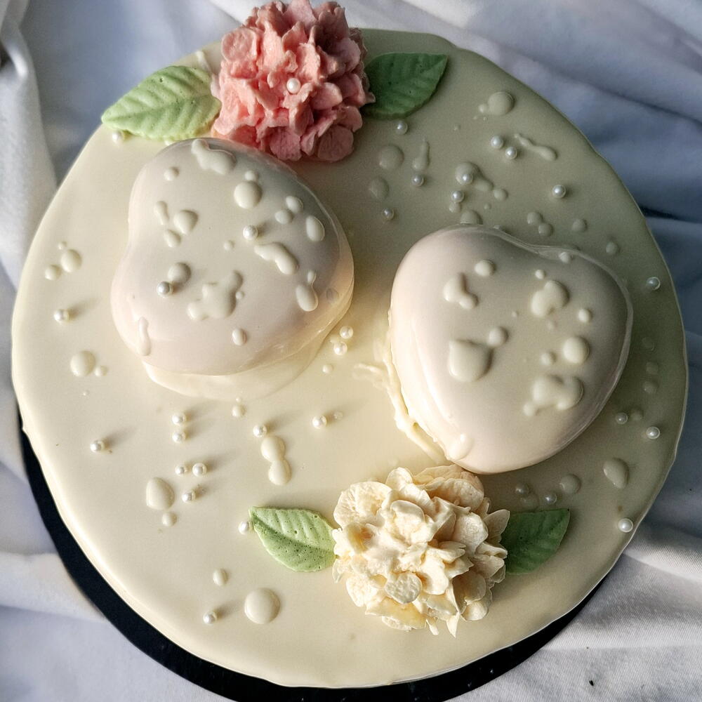 Торт нежное облако начинка Марс покрыт нижнейшей зеркальной глазурью украшен зефирными цветами и сердечками из зефира