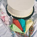 Коржи на сгущенке (сгущеное молоко, яйца, мука, разрыхлитель) Крем взбитые сливки (сливки 33%, сгущеное молоко). 4 цветных крема. (Твороженный сыр, сливочное масло, сахарная пудра) Посыпка кондитерская 4 вида.