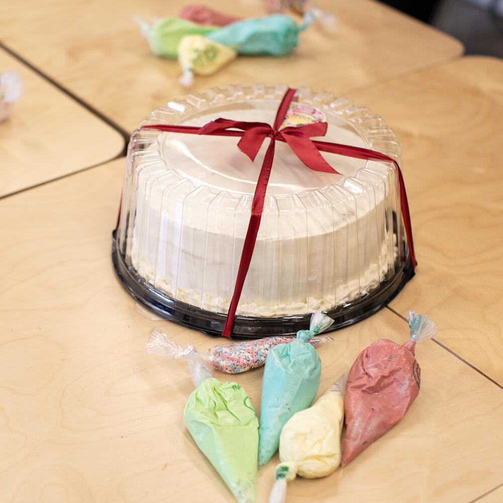 Коржи на сгущенке (сгущеное молоко, яйца, мука, разрыхлитель) Крем взбитые сливки (сливки 33%, сгущеное молоко). 4 цветных крема. (Твороженный сыр, сливочное масло, сахарная пудра) Посыпка кондитерская 4 вида.