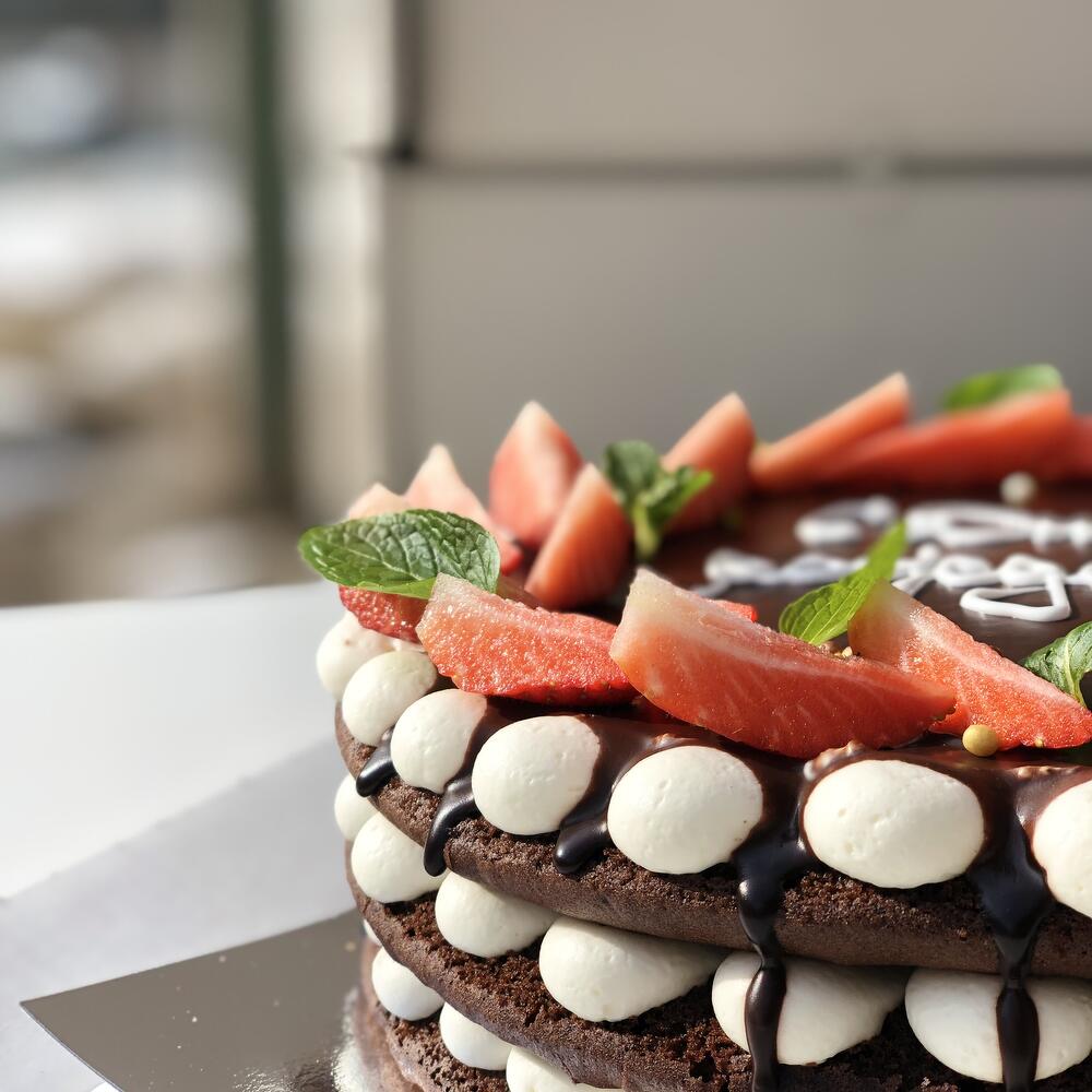 Whoopie pie — chocolate layers made with chocolate and cocoa. The layers are soaked with a creamy mascarpone cheese filling; the surface is covered with dark chocolate ganache. Decorated with fresh strawberries.