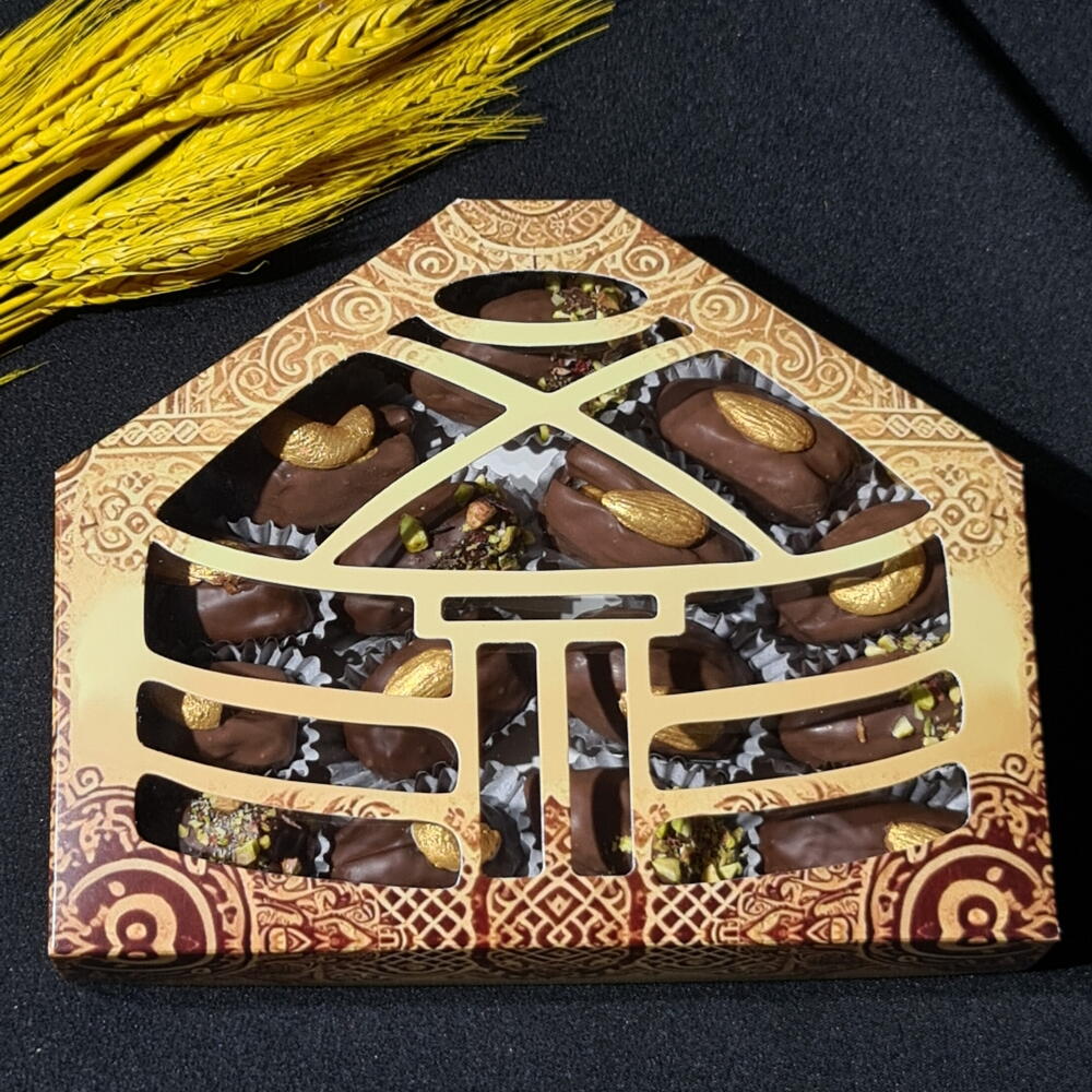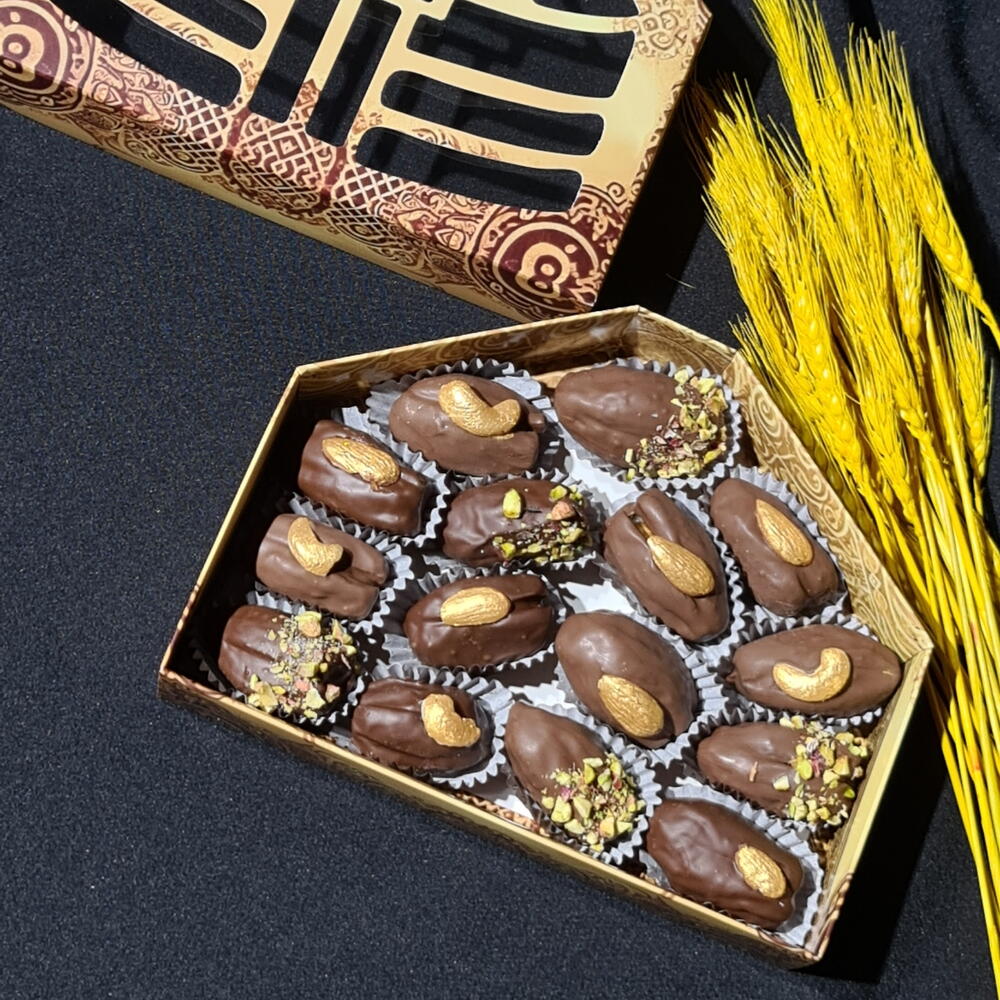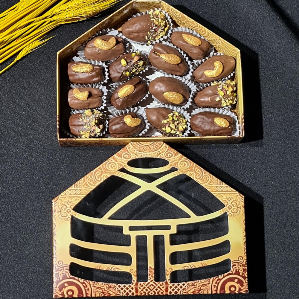 Королевские финики в бельгийском шоколаде с грецким орехом, украшенные дробленой фисташкой кешью и миндалём.