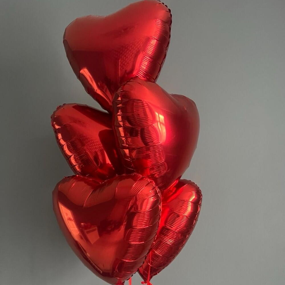 5 red heart-shaped foil balloons