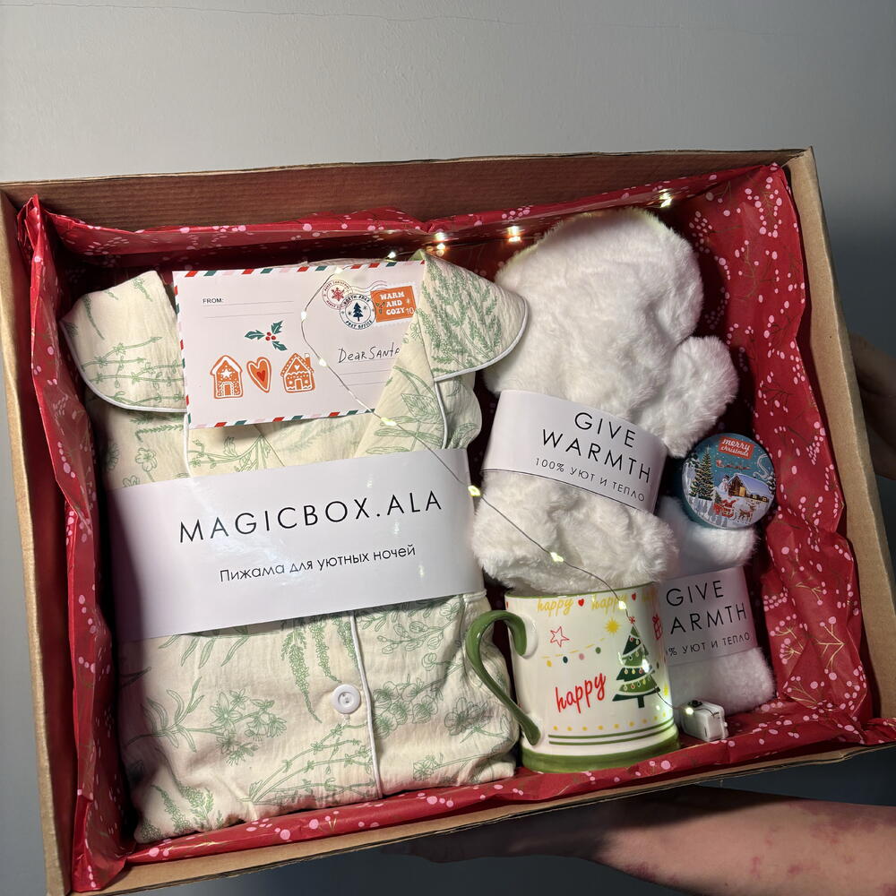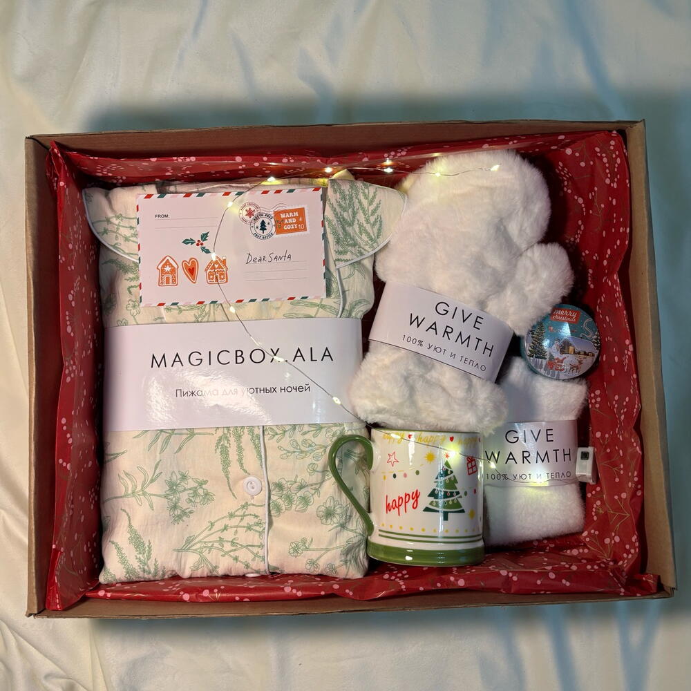 Тёплый и уютный подарок, созданный для комфорта и расслабления в зимние дни. Идеальный выбор, чтобы порадовать близкого человека заботой и новогодним настроением. В составе бокса: • муслиновая пижама — лёгкая, мягкая и приятная к телу • кружка для любимых горячих напитков • ароматная свеча для создания уютной атмосферы • тёплые варежки для зимних прогулок • мягкие носочки для домашнего уюта Бокс оформлен в праздничной подарочной упаковке и станет прекрасным подарком для близких, друзей или коллег. Подарите тепло, уют и атмосферу Нового года 🎄✨