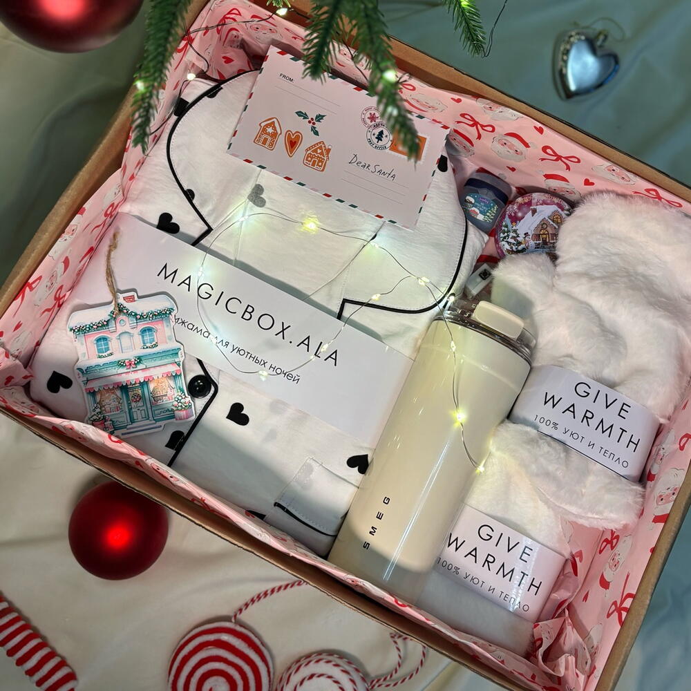 Нежный и уютный подарок, наполненный заботой и теплом. Этот бокс создан для комфортных зимних вечеров и особого новогоднего настроения. В составе бокса: • муслиновая пижама с принтом «сердце» — лёгкая, мягкая и невероятно приятная к телу • стильная термокружка SMEG — сохраняет тепло любимых напитков • ароматная свеча для создания уютной атмосферы • тёплые варежки для зимних прогулок • мягкие носочки для домашнего комфорта • бальзам для губ — забота и защита в холодное время года Бокс оформлен в элегантной подарочной упаковке и станет идеальным подарком для любимых, близких и тех, кому хочется подарить тепло и внимание. Подарите не просто вещи — подарите настроение, уют и любовь 🎄✨