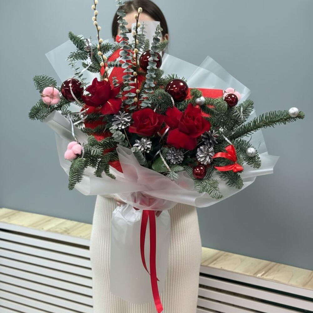 Willow - 2 pcs Cotton - 3 pcs Cones - 5 pcs Rose red 60 cm - 3 pcs Eucalyptus cinerea - 2 pcs Christmas - 9 pcs nobilis witband - 2 pcs