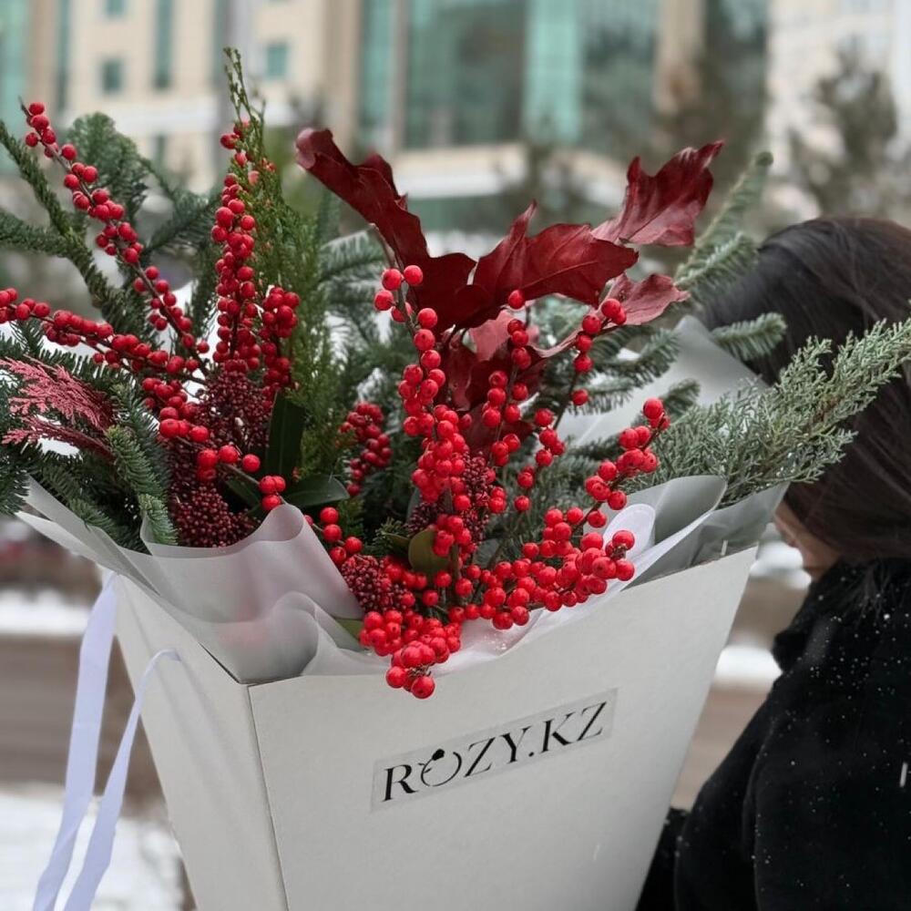 Skimmia - 1 pcs Designer packaging - 8 pcs Ilex red - 2 pcs thuja dyed - 1 pcs carrying for flowers - 1 pcs beech leaves, stabilized - 1 pcs nobilis l - 1 pcs туя зеленая - 1 pcs нобилис м - 1 pcs кипарис м - 1 pcs