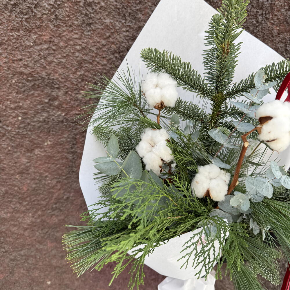 Интерьерная зимняя композиция из натуральной хвои, хлопка и эвкалипта. Сочетание плотной сосны, фактурной ели и мягких хлопковых акцентов создает эффект свежего леса в доме. Стильное украшение для зимнего сезона или уютный подарок с атмосферой праздника