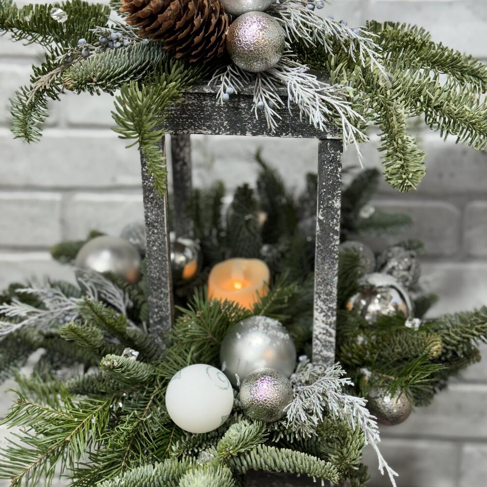 Wooden lantern Nobilis Fir Snow-covered branches Cones Decorative candle Christmas toy Oasis Glass beads