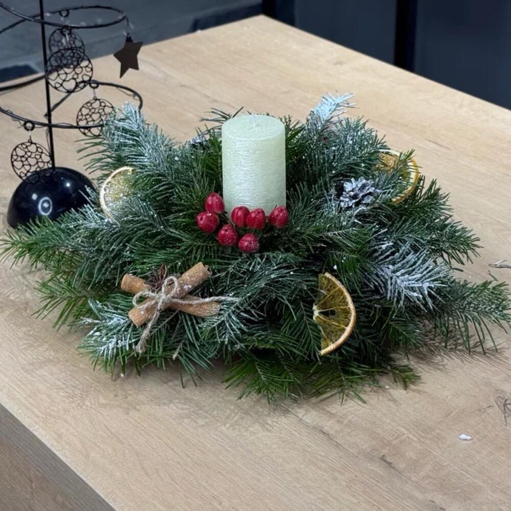 Новогодняя настольная композиция со свечкой, подойдет для праздничного стола или декора.