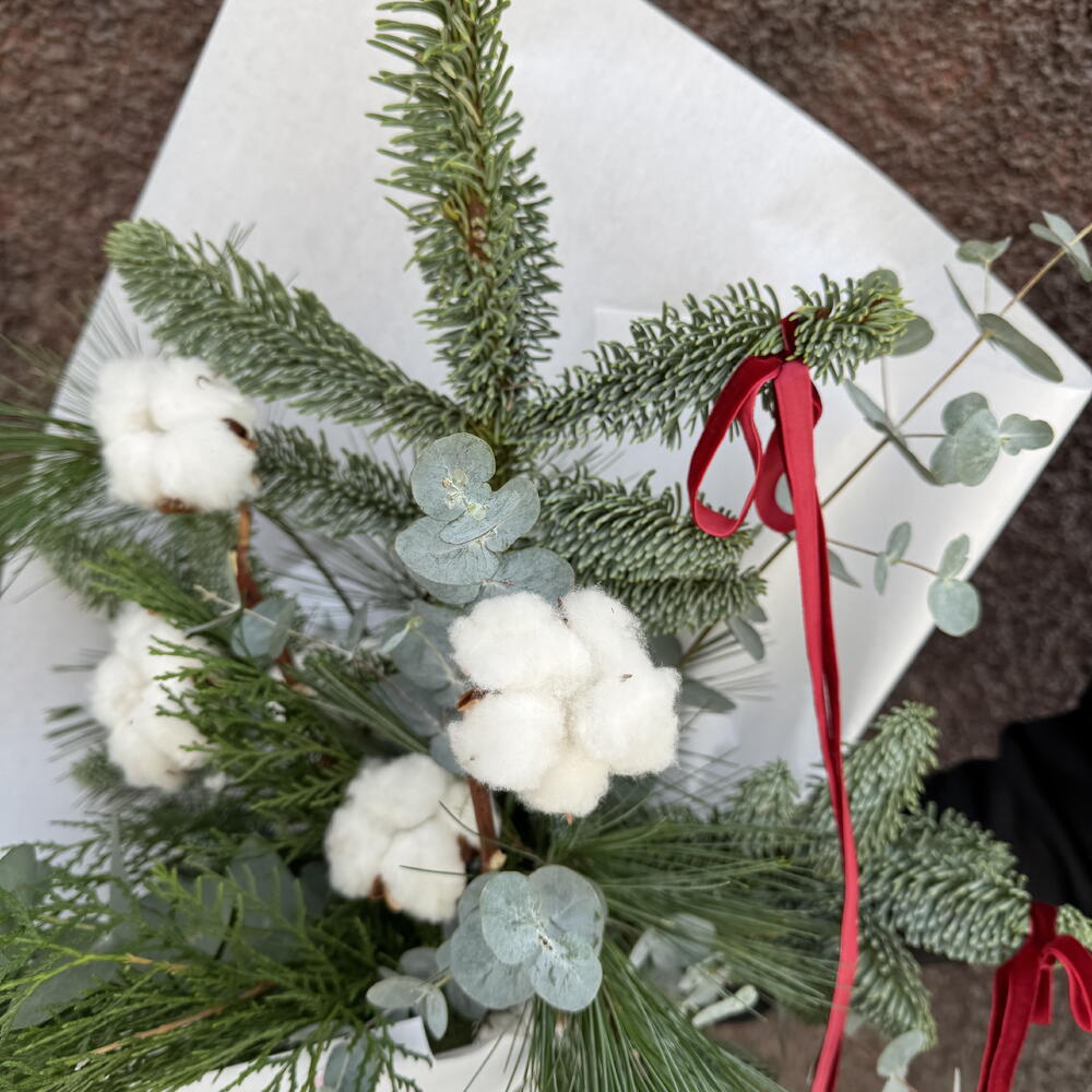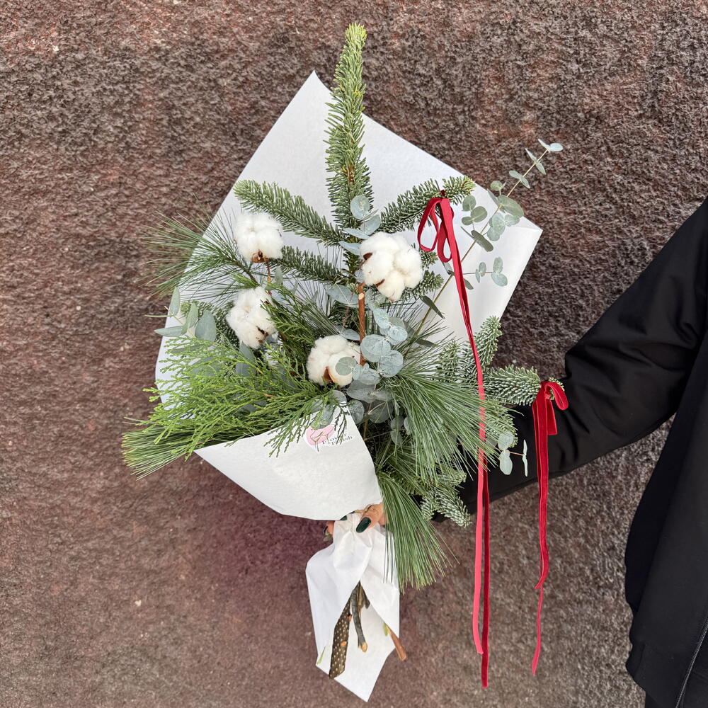 Интерьерная зимняя композиция из натуральной хвои, хлопка и эвкалипта. Сочетание плотной сосны, фактурной ели и мягких хлопковых акцентов создано эффект свежего леса в доме. Стильное украшение для зимнего сезона или уютный подарок с атмосферой праздника