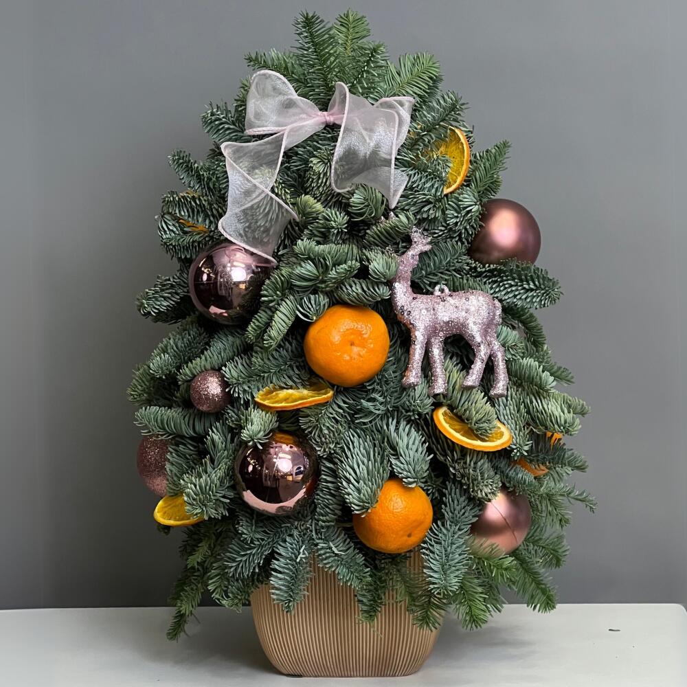 Ornamental flowerpot - 1 pcs Oasis - 1 pcs Balls - 25 pcs Deer - 1 pcs bow - 1 pcs Mandarins - 7 pcs dried fruit tangerine - 10 pcs