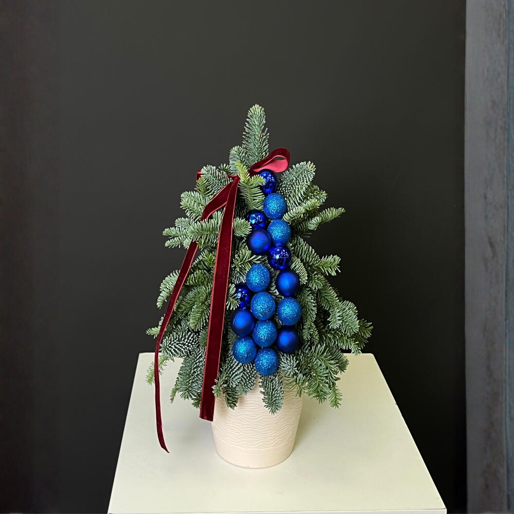 Ёлка из нобилиса Северное Сияние в кашпо — мини-ёлка с синими игрушками