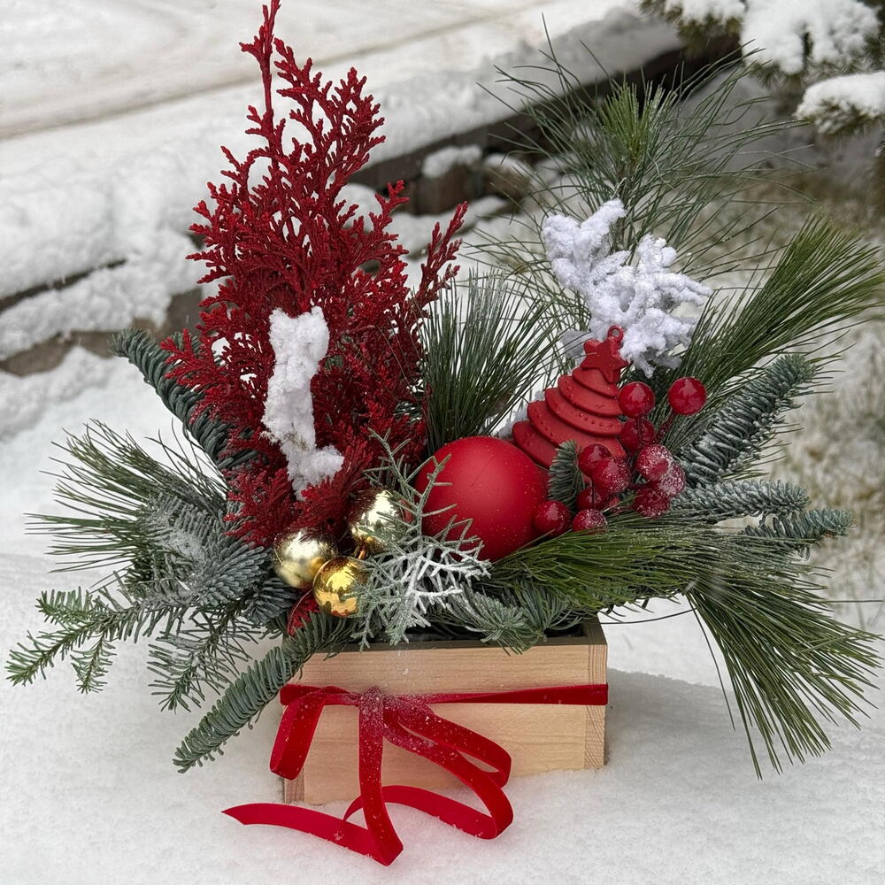 Ilex - 1 pcs The language is Russian. Here is the translation to English: "Ruscus" - 1 pcs Designer packaging - 1 pcs Wooden box - 1 pcs Toy Christmas - 3 pcs Floral oasis - 1 pcs thuja dyed - 1 pcs natural material - 7 pcs пинус с размер - 3 pcs нобилис хс размер - 2 pcs кипарис хс размер - 1 pcs