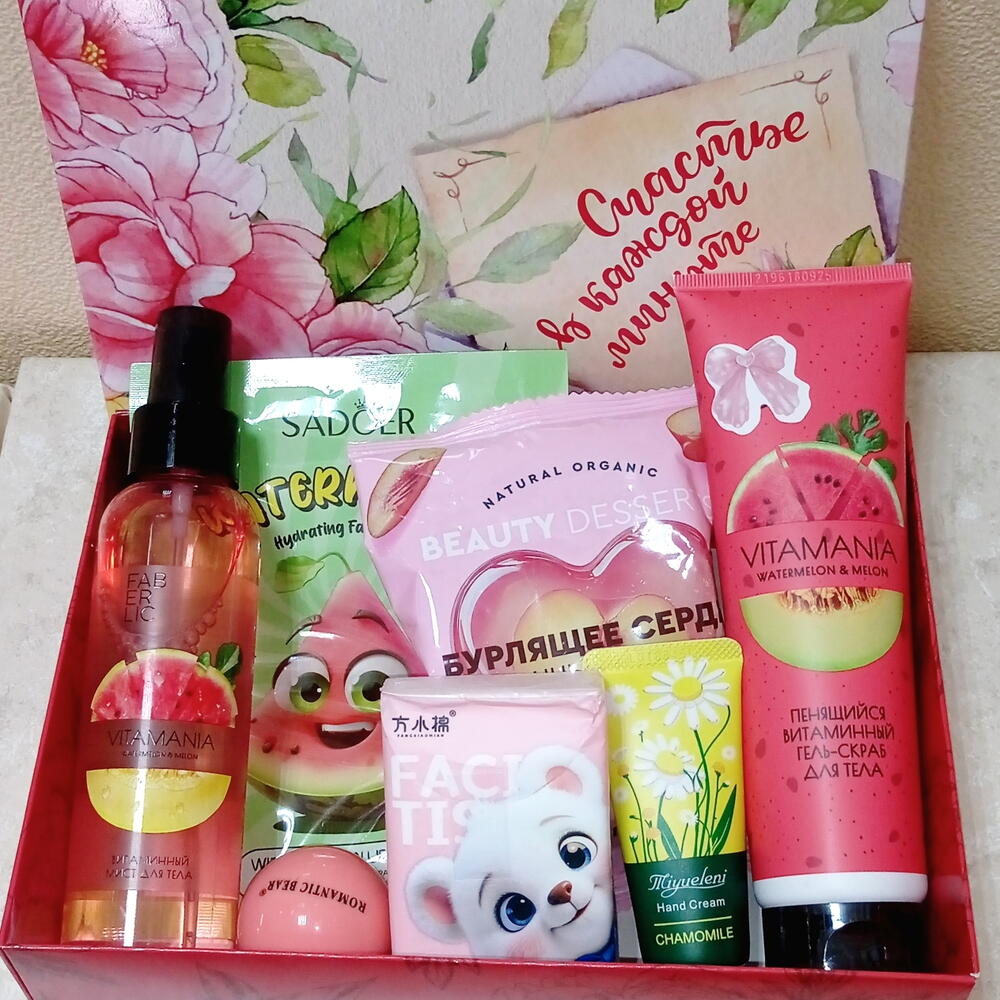 Foaming vitamin body gel-scrub Watermelon and Melon 150ml, vitamin body mist Watermelon and Melon 120ml, moisturizing face mask Watermelon 25g, hand cream 50ml, bath bomb Bubbling Heart 100g, lip balm romantic bear 12g, pocket tissues 6 pcs per pack, gift box