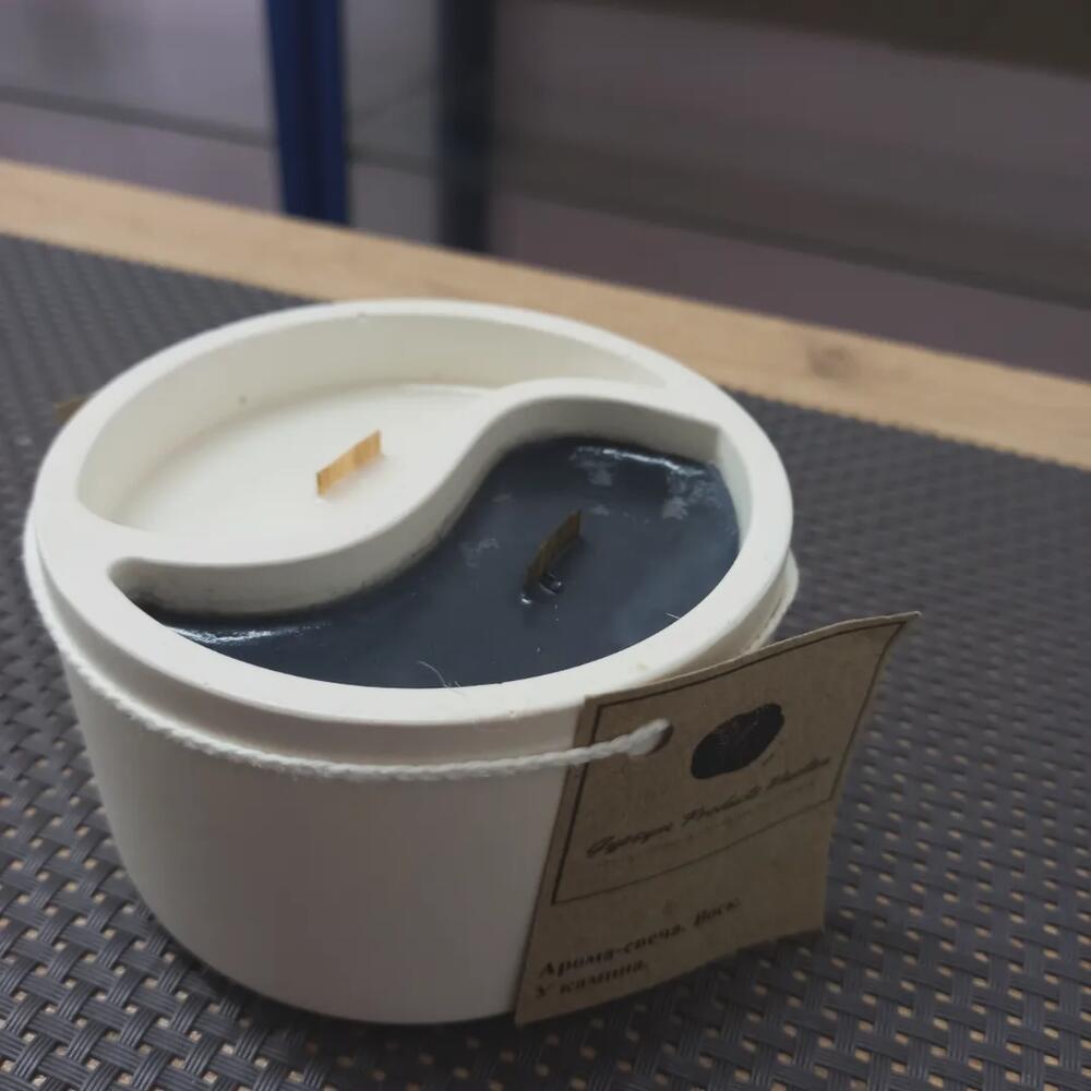 Арома-свеча в гипсовом подсвечнике. 2 аромата. Объём одной свечи 80мл, время горения до 15 часов. Ароматы - у камина, пион и роза. Фитиль деревянный.