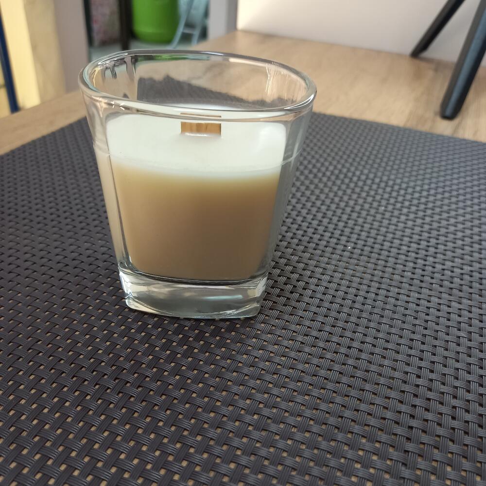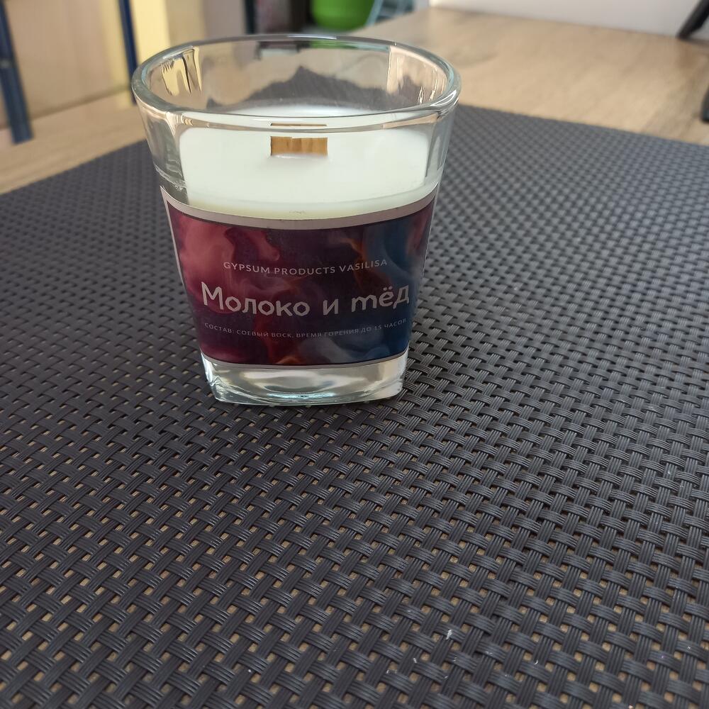 Арома-свеча. Аромат - молоко и мёд. Материал подсвечника - стекло. Материал свечи - соевый воск. Фитиль деревянный. Объём свечи 100мл. Время горения до 15 часов.