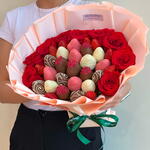 Композиция, в которой соединились страсть алых роз и нежность свежайшей клубники в бельгийском шоколаде. Каждая ягода покрыта тающим молочным и белым шоколадом Callebaut, декорирована вручную. А свежие эквадорские розы наполняют букет романтикой и изысканностью. Идеальный подарок для тех, кого хочется удивить и порадовать: в День рождения, на свидание, для выражения любви или просто — без повода.