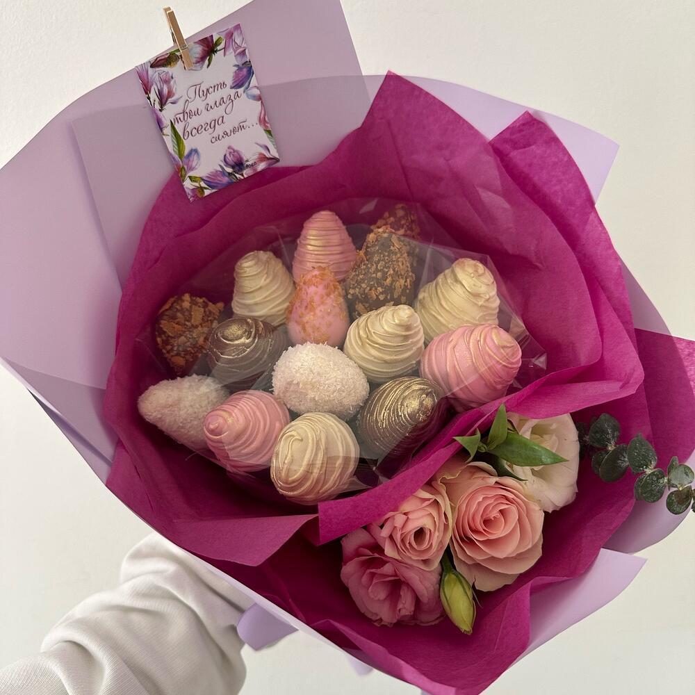 Lisianthus - 3 pcs Eucalyptus - 1 pcs Rose - 1 pcs Chocolate-covered strawberries - 15 pcs