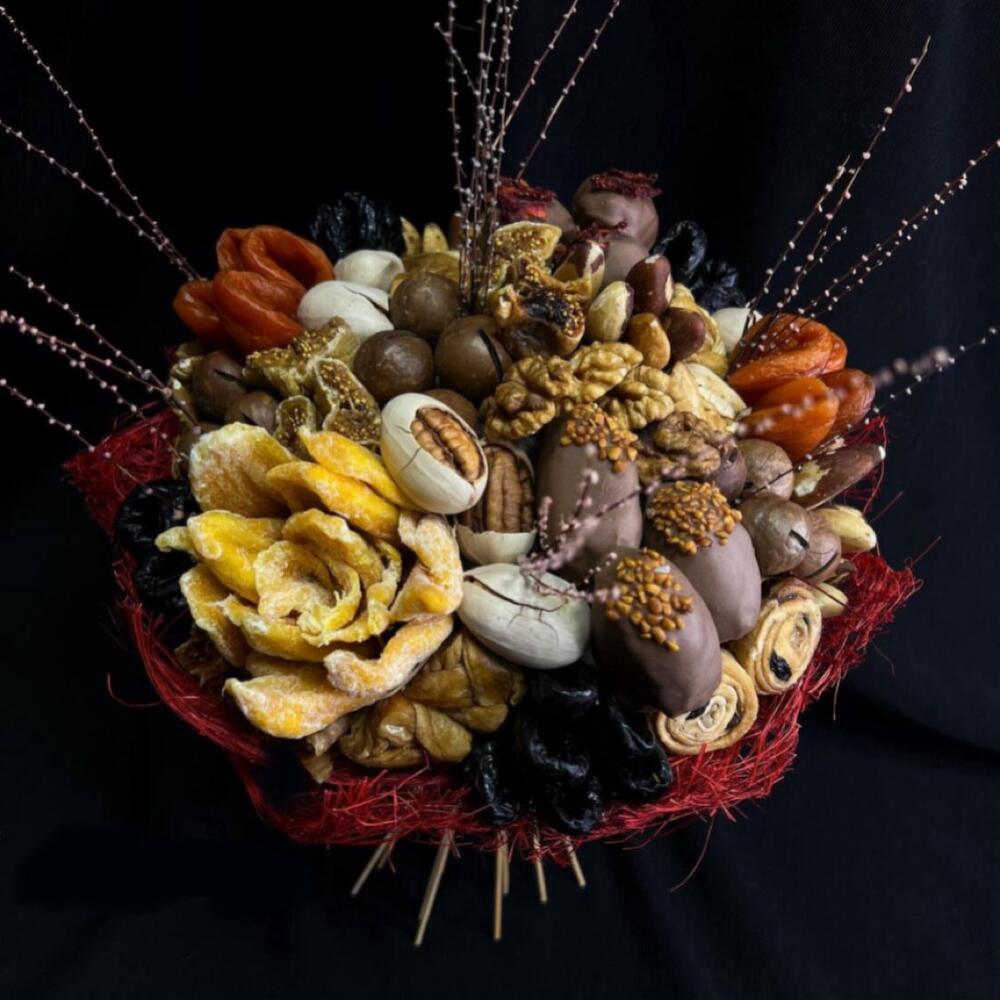 Walnut - 60 g Dried apricots - 100 g Prunes - 100 g Dried figs - 100 g Dried mango - 90 g chocolate dates - 6 pcs Brazil nuts - 60 g macadamia in shell - 100 g pecans in the shell - 100 g hashtag melon - 6 pcs melon pigtail dried fruit - 100 g