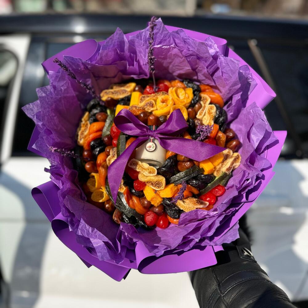 Сухофруктовый букет из свежих сухофруктов. В яркой весенней упаковке. Отлично подходящий в качестве подарка. Ширина указана с учетем упаковки !
