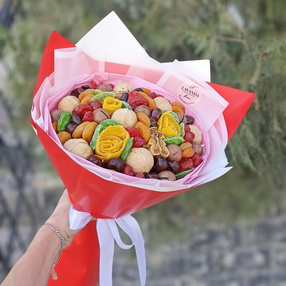 Walnut - 7 pcs Designer packaging - 3 pcs Fig - 4 pcs Dried apricots - 17 pcs Cherry dried - 20 pcs Dates - 17 pcs Dried mango - 3 pcs macadamia - 9 pcs kiwi dried fruit - 10 pcs
