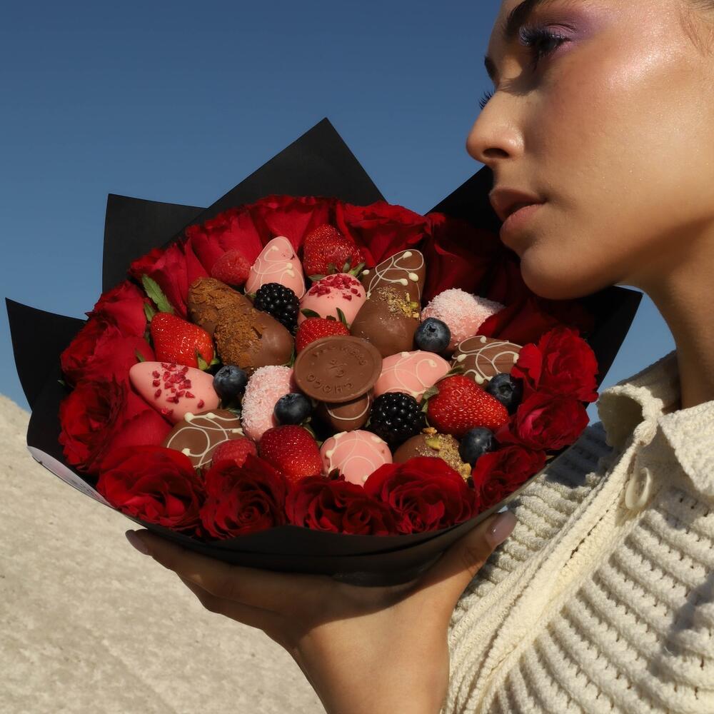 Handmade chocolate - 1 pcs fresh strawberries - 3 pcs fresh raspberries - 45 g fresh blueberries - 45 g fresh blackberries - 45 g a fresh branch of red currant - 1 pcs strawberries in milk and pink chocolate - 12 pcs цветы:красные розы - 12 pcs