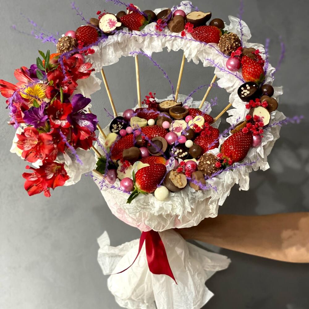 Strawberry - 250 g Chocolate dragees - 90 g Ferrero Rocher Candies - 3 pcs puffed rice - 10 g candy Milka - 7 pcs candy of topify - 4 pcs handmade chocolate heart - 5 pcs стильные штучки - 7 pcs конфеты cande - 4 pcs цветы альстромерияветки - 3 pcs