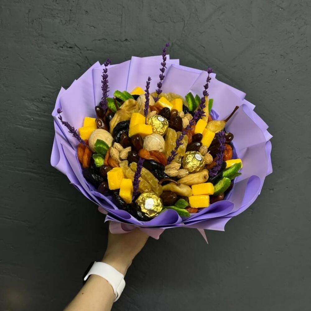 Walnut - 3 pcs Ferrero rocher - 3 pcs Almond - 50 g Dried apricots - 150 g Prunes - 150 g Dates - 150 g Dried pineapple - 5 pcs Pamella dried - 100 g mango marmalade - 10 pcs