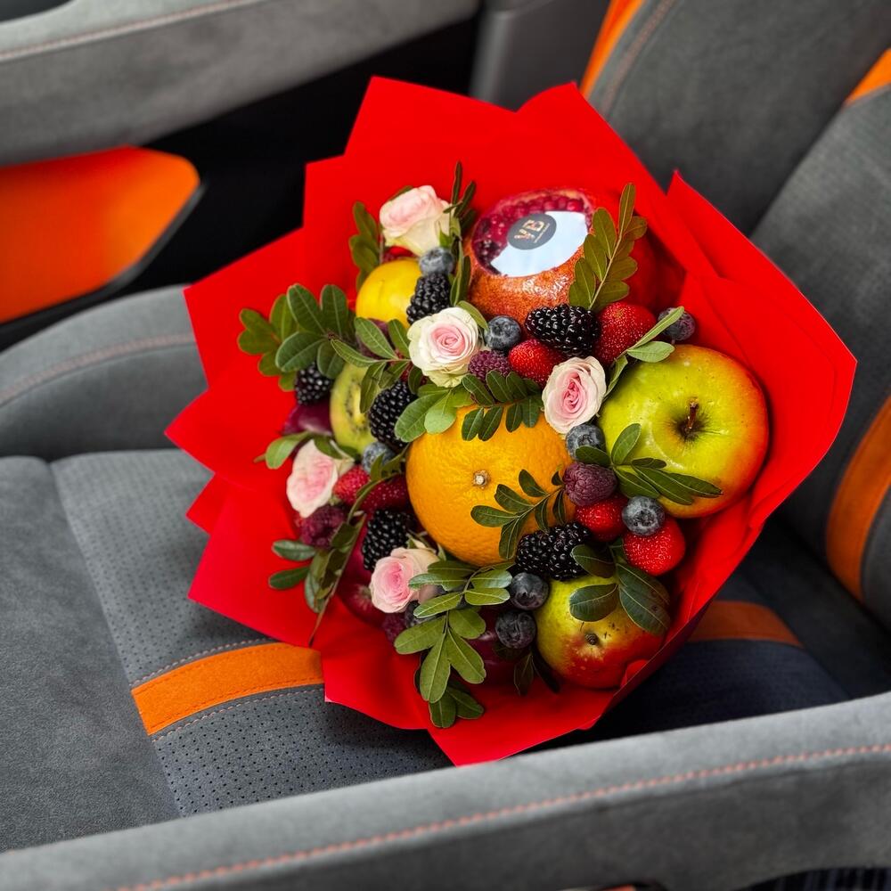 Strawberry - 5 pcs Kiwi - 2 pcs Raspberry - 90 g Pear - 1 pcs Plum - 2 pcs Blackberry - 6 pcs Blueberry - 90 g Spray rose - 1 pcs oranges - 1 pcs red apple - 1 pcs green apple - 1 pcs garnet red - 1 pcs