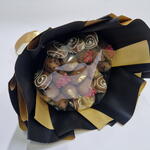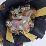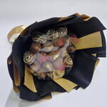 Состав: Клубника свежая, шоколад молочный бельгийский. Украшен шоколадными линиями, пищевыми блесками, сублимированной малиной и сусальным золотом. Все съедобное. Хранить в холодильнике не более 24 часов. Перед употреблением оставить при комнатной температуре на 15 минут. В количестве 19 шт. Букет с таким количеством получается круглым и красивым. Отличный подарок для мамы или девушки.