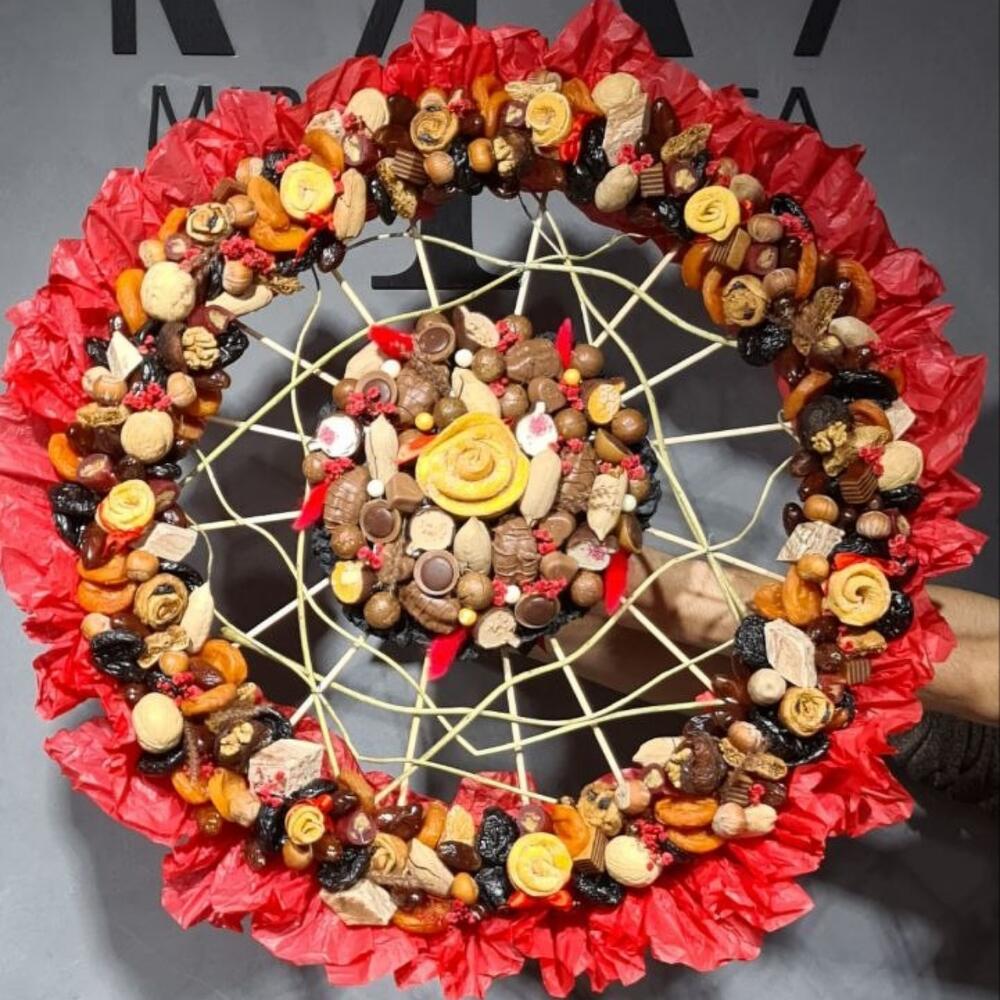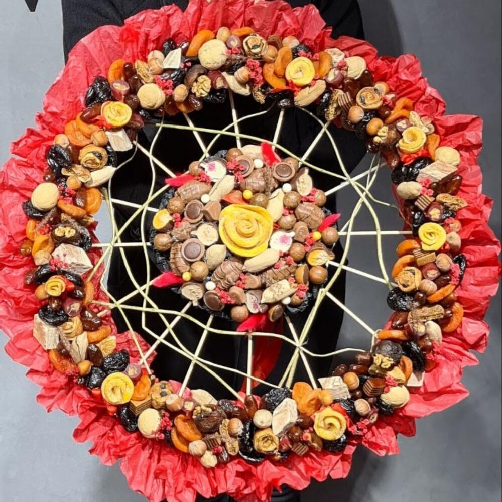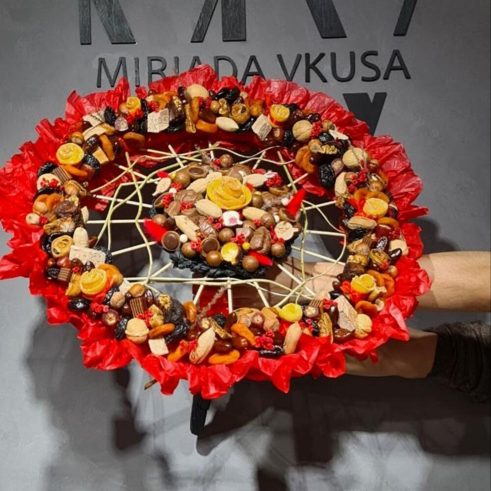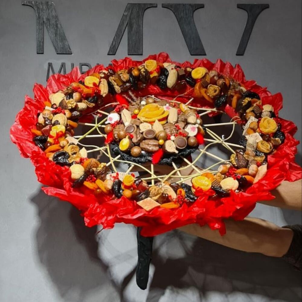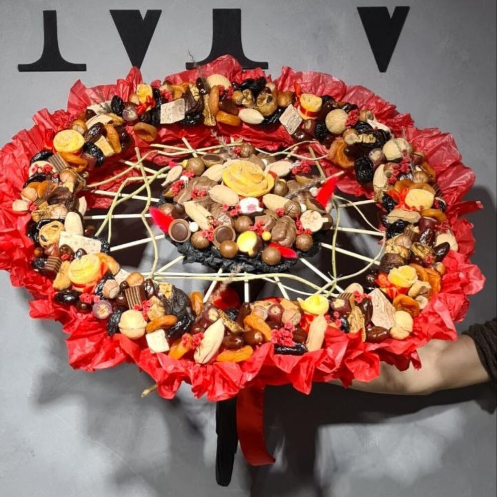 Fig - 90 g Pastille - 60 g Toffifee - 7 pcs Prunes - 350 g Dates - 370 g macadamia - 100 g churchkhela - 100 g hazelnut in shell - 80 g mango dried fruit - 282 g walnut in a shell - 96 g candy Milka - 5 pcs pecans in the shell - 157 g melon hashtag - 120 g хаштаг курага - 133 g финики королевские в бельгийском шоколаде - 6 pcs конфеты со вкусом клубники - 6 pcs