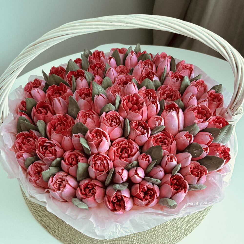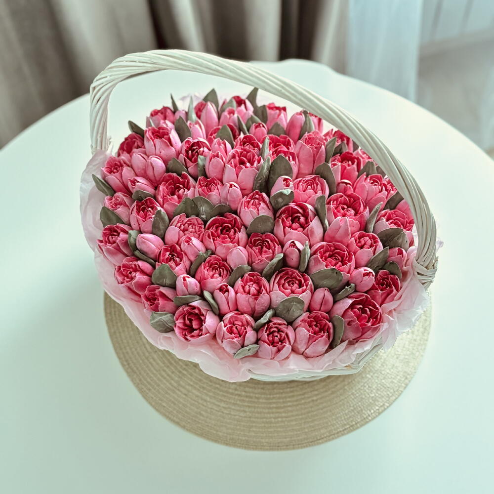Корзина весенних тюльпанов - большая охапка восторга! Зефирные тюльпаны могут выполнены также в белом, желтом, фиолетовом цвете по желанию заказчика.