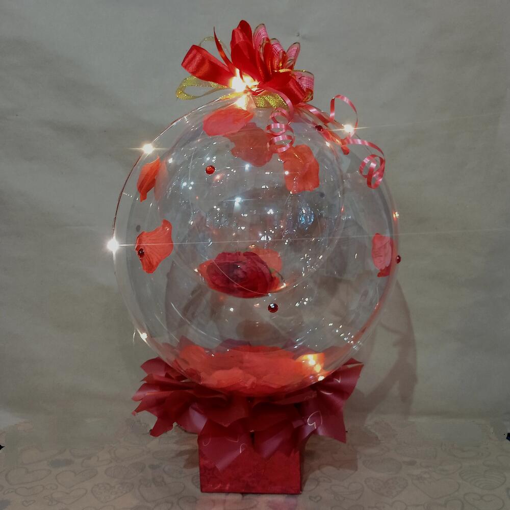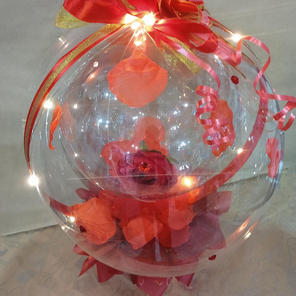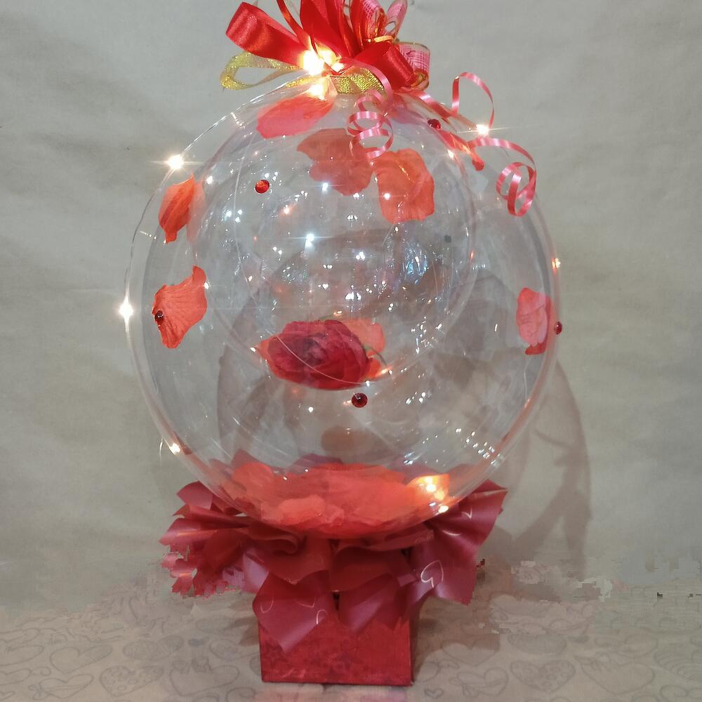 Романтичная подарочная композиция из шаров баблс, искусственных цветов и лепестков. Внутри большого шара лепестки розы и маленький шар с цветком и лепестками. В коробке под шаром конфеты Рафаэлло. Подойдёт в качестве подарка для девушки, женщины, девочки, поможет передать ваши нежные чувства и пожелания. Композиция дополнена подсветкой из светодиодной гирлянды.