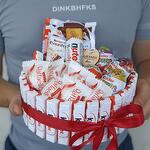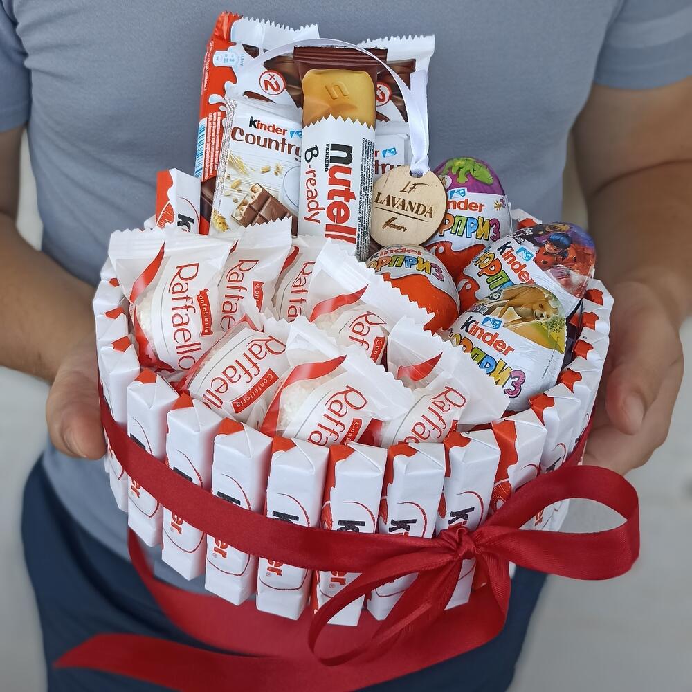 Tape - 1 pcs Raffaello - 7 pcs Kinder surprise - 4 pcs Kinder chocolate - 33 pcs Kinder Delis - 2 pcs Kinder Bueno - 2 pcs