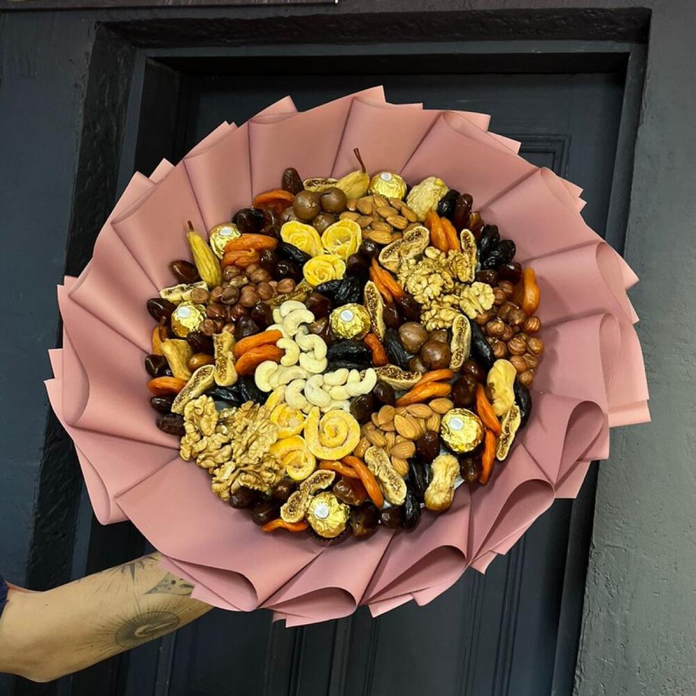 Walnut - 20 pcs Cashews - 20 pcs Ferrero rocher - 6 pcs Almond - 30 pcs Hazelnuts - 30 pcs Dried apricots - 15 pcs Prunes - 20 pcs Dried figs - 10 pcs macadamia in shell - 15 pcs mango dried fruit - 3 pcs dried pear - 5 pcs
