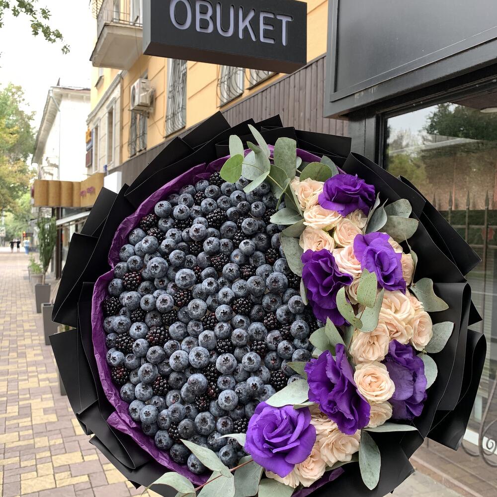 Lisianthus - 3 pcs Eucalyptus - 1 pcs Blackberry - 10 pcs Blueberry - 45 pcs rose spray - 5 pcs