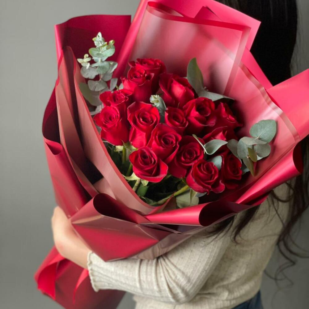 15 red roses with eucalyptus
