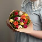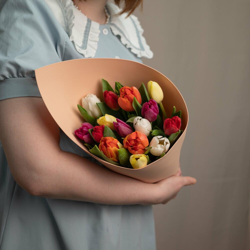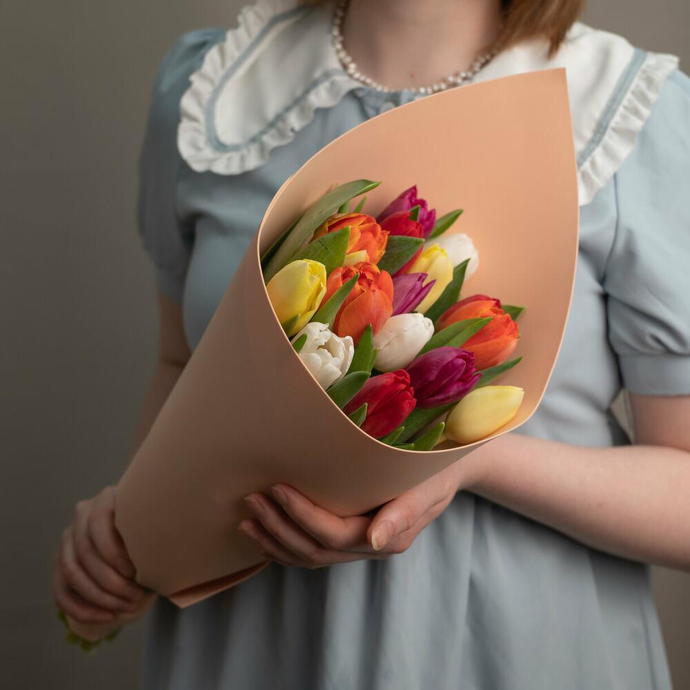 A bouquet of multicolored tulips - the perfect bouquet for celebrating International Women's Day! The studio reserves the right to change the ratio of tulips by color, to replace tulips with similar varieties. But the bouquet will always match the size and be multicolored!🌱 The bouquet will be suitable as a gift for mom, grandmother, girlfriend, wife, aunt, daughter, sister, a manager or coworker, a doctor or teacher, for any occasion.