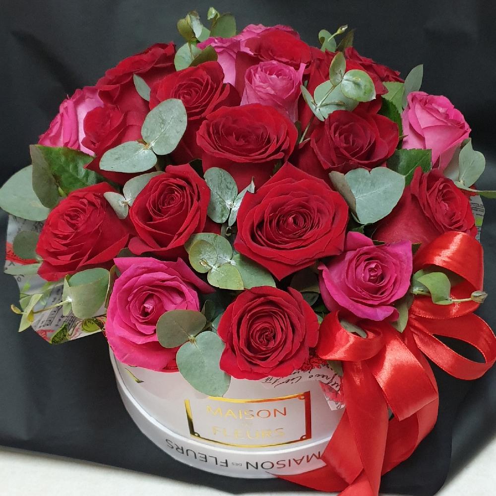 Eucalyptus - 2 pcs Hat box - 1 pcs roses ecuador - 21 pcs