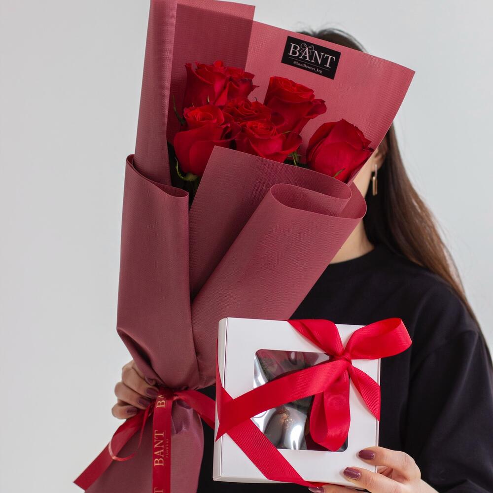 7 метровых роз+ 9 клубники в шоколаде